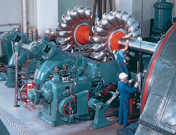 Справочник / История техники, технологии, предметов вокруг нас Турбина - ротационный двигатель с непрерывным рабочим процессом и вращательным движением рабочего органа (ротора), преобразующий кинетическую энергию и/или внутреннюю энергию рабочего тела (пара, газа, воды) в механическую работу. Струя рабочего тела воздействует на лопатки, закрепленные по окружности ротора, и приводит их в движение. Применяется в качестве привода электрического генератора на тепловых, атомных и гидро электростанциях, как составная часть приводов на морском, наземном и воздушном транспорте, а также гидродинамической передачи, гидронасосах.