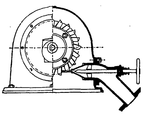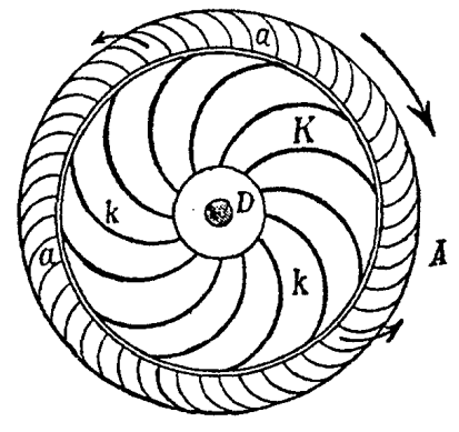 Его турбина состояла из двух концентрических, лежащих друг против друга колес: внутреннего, неподвижного K, представлявшего из себя направляющий аппарат, и внешнего с изогнутыми лопатками a, которое и было рабочим турбинным колесом. Вода поступала в турбину сверху через трубу, обхватывавшую вал турбины, и попадала на лопатки направляющего аппарата. Эти лопатки принуждали воду двигаться по кривой линии, вследствие чего она втекала в горизонтальном направлении в лопатки турбинного колеса, без удара, по всей его внутренней окружности, отдавая последнему всю свою энергию, а затем равномерно стекала по его внутренней окружности. Вновь поступающая и отработанная вода нигде не смешивались между собой. Турбинное колесо было накрепко соединено с вертикальным валом D, через который передавалось движение. КПД турбины Фурнейрона достигал 80%. Созданная им конструкция имела громадное значение для дальнейшей истории турбостроения. Слух об этом удивительном изобретении быстро распространился по всей Европе. Специалисты-инженеры из многих стран в течение нескольких лет приезжали в глухое местечко Шварцвальда, чтобы осматривать работавшую там турбину Фурнейрона как великую достопримечательность. Вскоре турбины стали строить по всему миру. Переход к турбинам стал революционным переворотом в истории гидравлических двигателей. В чем же заключалось их преимущество перед старым водяным колесом? В приведенном выше кратком описании турбины Фурнейрона трудно увидеть колесо Сегнера. Между тем она основана на том же принципе использования реактивного движения водяной струи (отчего этот тип турбин и получил позже название реактивных). Просто Фурнейрон внимательно учел все замечания Эйлера и использовал свой собственный опыт инженера-гидравлика. Турбина Фурнейрона отличалась от водяного колеса несколькими принципиальными моментами. В водяном колесе вода входила и выходила в одном и том же месте. Из-за этого как скорость, так и направление движения воды в лопатке колеса были различны в разные моменты времени - колесо как бы затрачивало изрядную часть своей полезной мощности на постоянное преодоление сопротивления струи. В турбине Фурнейрона вода из направляющего аппарата входила на одну кромку лопатки колеса, проходила по лопатке и стекала с другой ее стороны. Вследствие этого в турбине вода не останавливалась, не меняла направления своего течения на обратное, а от входных до выходных кромок текла непрерывно. В каждой точке лопаток скорость ее была одинакова по направлению и отличалась только по величине. В результате скорость вращения турбины теоретически зависела только от скорости воды, и поэтому турбина могла вращаться в несколько десятков раз быстрее обычного водяного колеса. Другое выгодное отличие турбины заключалось в том, что вода одновременно проходила по всем лопаткам колеса, а в водяном колесе - только через некоторые. В результате, энергия водяной струи использовалась в турбине гораздо полнее, чем в водяном колесе, а ее габариты при той же мощности были в несколько раз меньше. В последующие годы выработалось несколько основных видов гидротурбин. Не вдаваясь здесь в подробности, отметим, что все турбины XIX века можно условно разделить на два основных типа: реактивные и струйные. Реактивная турбина, как уже говорилось, 
