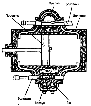 Паровой двигатель не до конца разрешил энергетическую проблему, стоявшую перед человечеством. Небольшие мастерские и предприятия, составлявшие в XIX веке большую часть промышленного сектора, не всегда могли им воспользоваться. Дело в том, что маленький паровой двигатель имел очень невысокий КПД (менее 10%). Кроме того, использование такого двигателя было связано с большими затратами и хлопотами. Для того чтобы запустить его в ход, необходимо было развести огонь и навести пары. Даже если машина была нужна только временами, ее все равно приходилось постоянно держать под парами. Для мелкой промышленности требовался двигатель небольшой силы, занимающий мало места, который можно было бы включать и останавливать в любое время без долгой подготовки. Впервые идея такого двигателя была предложена в самом начале XIX века. В последний год XVIII века французский инженер Филипп Лебон открыл светильный газ. Традиция приписывает его успех случайности - Лебон увидел, как вспыхнул газ, истекавший из поставленного на огонь сосуда с древесными опилками, и понял, какую пользу можно извлечь из этого явления. В 1799 году он получил патент на использование и способ получения светильного газа путем сухой перегонки древесины или угля. Это открытие имело огромное значение прежде всего для развития техники освещения. Очень скоро во Франции, а потом и в других странах Европы газовые лампы стали успешно конкурировать с дорогостоящими свечами. Однако светильный газ годился не только для освещения. В 1801 году Лебон взял патент на конструкцию газового двигателя. Принцип действия этой машины основывался на известном свойстве открытого им газа: его смесь с воздухом взрывалась при воспламенении с выделением большого количества теплоты. Продукты горения стремительно расширялись, оказывая сильное давление на окружающую среду. Создав соответствующие условия, можно использовать выделяющуюся энергию в интересах человека. В двигателе Лебона были предусмотрены два компрессора и камера смешения. Один компрессор должен был накачивать в камеру сжатый воздух, а другой - сжатый светильный газ из газогенератора. Газовоздушная смесь поступала потом в рабочий цилиндр, где воспламенялась. Двигатель был двойного действия, то есть попеременно действовавшие рабочие камеры находились по обе стороны поршня.