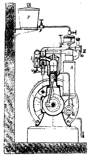 Первая модель бензинового двигателя предназначалась для промышленной стационарной установки. Здесь P - бак для бензина, из которого при помощи запорного клапана p через трубу пропускалось столько бензина к прибору для испарения его AB, что A всегда оставался наполненным примерно на 2/3. B - это лампа, которая наполнялась первой, еще до попадания бензина в A. Из лампы B через трубку с клапаном V бензин подводился к горелке, находившейся в оболочке L; он вытекал тонкой струйкой из узкого наконечника горелки и благодаря высокой температуре горелки сейчас же испарялся. Пламя горело вокруг платинового зажигателя и накаляло его. В приборе для испарения A пары бензина образовывались при просасывании через бензин подогретого воздуха. Пары эти смешивались с воздухом в регулировочном кране H, и таким образом получалась горючая газовая смесь. При ходе поршня вниз он всасывал эту смесь, при обратном ходе сжимал ее в пространстве,) предназначенном для сжатия. В то время, когда поршень находился в верхней мертвой точке, распределительный механизм открывал накаленный платиновый зажигатель, заряд взрывался, и газообразные продукты горения давили на поршень. Для образования паров бензина воздух, как отмечалось выше, должен был предварительно нагреваться. Это достигалось тем, что воздух перед поступлением в испаритель проходил через кожух горелки.