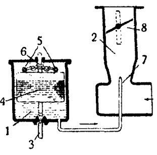 В отличие от своих предшественников Банки предлагал не испарять бензин, а мелко распылять его в воздухе. Это обеспечивало его равномерное распределение по цилиндру, а само испарение происходило уже в цилиндре под действием тепла сжатия. Для обеспечения распыления всасывание бензина происходило потоком воздуха через дозирующий жиклер, а постоянство состава смеси достигалась за счет поддержания постоянного уровня бензина в карбюраторе. Жиклер выполнялся в виде одного или нескольких отверстий в трубке, располагавшейся перпендикулярно потоку воздуха. Для поддержания напора был предусмотрен маленький бачок с поплавком, который поддерживал уровень на заданной высоте, так что количество всасываемого бензина было пропорционально количеству поступающего воздуха. Таким образом, карбюратор состоял из двух частей: поплавковой камеры 1 и смесительной камеры 2. В камеру 1 топливо свободно поступало из бака по трубке 3 и держалось на одном уровне поплавком 4, который поднимался вместе с уровнем топлива и при наполнении, с помощью рычага 5, спускал иглу 6 и тем закрывал доступ топливу. Из камеры 1 топливо свободно протекало в камеру 2 и останавливалось в жиклере 7 на одном уровне с камерой 1. Камера 2 снизу имела отверстие, сообщавшееся с наружным воздухом, а вверху - с всасывающим клапаном двигателя. Количество доставляемой в цилиндр смеси регулировалось поворачиванием дросселя (заслонки) 8. При всасывающем ходе поршня воздух устремлялся снизу в камеру смешения и засасывал из жиклера топливо, распыляя и испаряя его. Первые двигатели внутреннего сгорания были одноцилиндровыми, и, для того чтобы увеличить мощность двигателя, обычно увеличивали объем цилиндра. Потом этого стали добиваться увеличением числа цилиндров. В конце XIX века появились двухцилиндровые двигатели, а с начала XX столетия стали распространяться четырехцилиндровые. Последние устраивались таким образом, что в каждом из цилиндров четырехтактный цикл был двинут на один ход поршня. Благодаря этому достигалась хорошая равномерность вращения коленчатого вала.