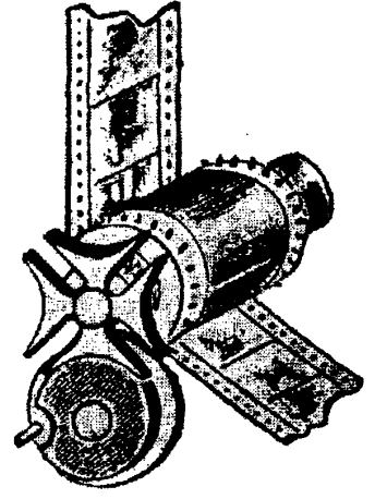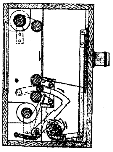 Пленка у Фризе-Грина поступала с подающего барабана на приемный. Последний, с помощью рукоятки, вращаемой рукой, приводился в непрерывное движение. Плечо, несущее вращающийся ролик, получало движение посредством спирального кулачка и принимало положение, показанное пунктирными линиями; при своем движении оно тянуло вниз пленку, которая затем оставалась неподвижной, пока ролик отходил под действием пружины. Одновременно с отходом плеча затвор открывался посредством такого же спирального кулачка. Последний был сконструирован на валу, приводимом в движение рукой. Каждый оборот, таким образом, экспонировал отдельный кадр пленки. Уже в 1889 году Фризе-Грин снял в Гайд-парке свой первый фильм и продемонстрировал его на фотографическом съезде в Таунн-холле. В 1890 году состоялась публичная демонстрация его фильмов в Королевском фотографическом обществе. Съемочная камера Фризе-Грина с перфорированной целлулоидной лентой имела все элементы кинематографа, кроме технически совершенного скачкового механизма прерывистого движения пленки. Однако его аппараты были очень сложны и в этом виде не могли получить широкого распространения. Более того, за пределами Англии о его изобретении почти ничего не было известно. В середине 90-х годов сразу несколько изобретателей приблизились к созданию кинематографа. В 1893 году создал свой кинетоскоп Эдисон. Этот прибор представлял собой ящик с окуляром, через который смотрел зритель. В окуляр было видно матовое стекло, на которое снизу проецировалось заснятое на пленку изображение. В том же году Эдисон организовал свою студию, в которой были сняты первые на американском континенте фильмы - коротенькие, на 20-30 секунд демонстрации. Длина ленты не превышала 15 м. В этой студии снимались известные танцовщицы, акробаты и дрессированные животные. В апреле 1894 года в Нью-Йорке на Бродвее был открыт первый салон кинетоскопов. Заплатив 25 центов за вход, зрители шли вдоль ряда кинетоскопов и смотрели в окуляры, а служащий включал кинетоскопы один за другим. Вскоре Эдисон сделал кинетоскоп автоматическим - автомат начинал действовать после опускания в щель монеты достоинством в 5 центов. Без сомнения, кинетоскоп являлся выдающимся техническим достижением. Но все же это еще не был кинематограф. Скачкового механизма он не имел. Между тем главной частью кинематографа, "сердцем" киносъемочного и кинопроекционного аппарата являлся именно скачковый механизм для быстрой, прерывистой смены изображений. Изобретение совершенного скачкового механизма, который позволил с установленной частотой осуществлять одновременно быстрое прерывистое передвижение отдельных подвижных изображений и их мгновенную остановку, стало тем событием, которое и ознаменовало рождение кинематографа. В 1893 году Марей создал новый хронофотографический аппарат с целлулоидной пленкой. Пленка здесь двигалась прерывисто, делая мгновенные остановки с частотой 20 отдельных снимков в секунду. Однако механизм прерывистого движения был крайне примитивным. Он состоял из электромагнита и прижимных валиков. В момент срабатывания затвора валик притягивался и останавливал пленку. Действие этого механизма было очень грубым, поэтому аппарат Муррея нельзя считать технически удовлетворительным. Тем не менее в том же году Марей снял несколько замеча