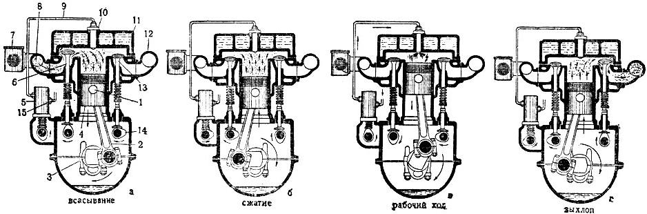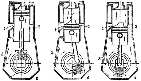 В июне 1894 году был построен второй двигатель, для которого Дизель придумал форсунку, управлявшую впрыском керосина. В этой модели давление в цилиндре доводилось до 35-40 атм, а температура в конце сжатия - до 500-600 градусов. Мотор не только удалось запустить, но и заставить работать на холостом ходу с частотой до 80 оборотов в минуту. Это был большой успех - идея Дизеля оказалась жизнеспособной. В 1895 году был построен третий двигатель, который мог уже работать с небольшой нагрузкой. Для впрыскивания керосина здесь впервые был предусмотрен компрессор. Кроме того, пришлось разработать систему интенсивного охлаждения, чтобы предотвратить заклинивание цилиндра. Только после этого в 1896 году запуск нового опытного образца принес успех. При испытании с нагрузкой КПД мотора оказался 36%, а расход керосина составил около 200 г на лошадиную силу в час. Хотя эти показатели и были очень далеки от параметров "идеального мотора", они все же впечатляли: КПД нового двигателя оказался на 10-12% выше, чем у бензиновых двигателей того времени, а по своей экономичности он превосходил их почти в два раза. Пусть Дизелю не удалось исполнить свою мечту, все же сделанное им имело огромное значение - благодаря его настойчивости была разработана принципиально новая конструкция двигателя внутреннего сгорания, которая была и остается лучшей на протяжении ста последних лет. Работал новый мотор следующим образом. При первом ходе поршня за счет живой силы маховика, запасенного за предыдущую работу машины, воздух всасывался внутрь цилиндра. Во время второго хода, совершаемого также за счет живой силы маховика, запертый в цилиндре воздух сжимался до 35 атм. При этом теплота, выделявшаяся при сжатии, доводила его до температуры воспламенения горючего. В начале третьего хода при помощи насоса вводился керосин. Это впрыскивание продолжалось лишь незначительную часть хода. В течение остальной части хода газовая масса расширялась, и поршню сообщалась рабочая сила, которая и передавалась через шатун коленчатому валу двигателя. При четвертом ходе продукты сгорания извергались через выхлопную трубу в атмосферу. Двигатель был снабжен компрессором, который в особом резервуаре сгущал воздух при давлении, несколько превышавшем самое высокое давление в цилиндре. Из этого резервуара воздух через трубку очень незначительного диаметра направлялся в маленькую камеру форсунки, то есть аппарата для распыления подаваемого горючего, куда одновременно подавался керосин. Эта камера сообщалась с внутренностью цилиндра при помощи маленького отверстия, запираемого иглой: когда эта игла приподнималась, керосин вгонялся в цилиндр благодаря избытку давления в камере. Горение в цилиндре регулировалось, смотря по силе, которую должен был развить двигатель, либо изменением продолжительности впуска горючего, либо изменением давления в компрессоре. Этот же сжатый воздух употреблялся и для начального пуска двигателя из холодного состояния. Наверху двигателя помещался распределительный вал с пятью кулачками один управлял клапаном, впускавшим воздух, другой - клапаном, впускавшим керосин, третий - клапаном, выпускавшим продукты сгорания. Два последних кулачка управляли клапанами, при помощи которых впускался сжатый воздух в цилиндр при первоначальном пуске двигателя.