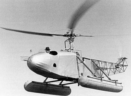 В том, что одновинтовая схема все-таки утвердилась в вертолетостроении как главенствующая, огромная заслуга принадлежит американскому авиаконструктору Игорю Сикорскому. (Русский по происхождению он в 1919 г эмигрировал в Америку, а в 1923 г. основал здесь свою фирму "Сикорский".) За свою жизнь Сикорский разработал несколько десятков моделей самолетов, но мировую славу ему принесло создание вертолета. Именно он впервые довел до совершенства классическую одновинтовую схему Юрьева. Свой первый вертолет S-46 (VC-300) Сикорский построил в 1939 году. Он сразу отказался от мысли определить все параметры аппарата путем расчетов и решил создать такой вертолет, в который в ходе летных испытаний можно было бы легко вносить конструктивные изменения. Его машина имела подчеркнуто примитивный вид: простой фюзеляж был собран в виде фермы из стальных труб, летчик открыто сидел в маленьком кресле впереди двигателя. Движение от небольшого двигателя в 65 л.с. передавалось посредством ремней вверх на редуктор, от которого приводился простой по конструкции трехлопастный и трехшарнирный несущий винт. Хвостовой однолопастный рулевой винт устанавливался на длинной коробкообразной балке.