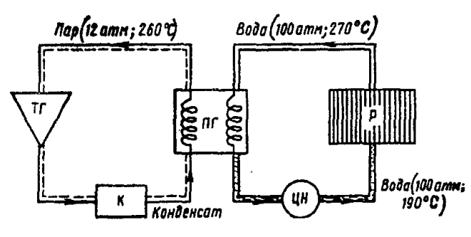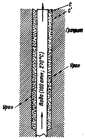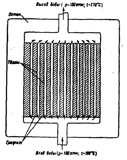 Энергетический реактор был не столько промышленным, сколько научным объектом. Непосредственно строительством АЭС руководила Обнинская физико-энергетическая лаборатория, основанная в 1947 году. В первые годы здесь не было ни достаточных научных сил, ни необходимого оборудования. Условия жизни также были далеки от приемлемых. Город только строился. Неасфальтированные улицы покрывались весной и осенью непролазной грязью, в которой безнадежно вязли машины. Большинство жителей ютилось в дощатых бараках и неуютных "финских" домиках. Лаборатория располагалась в совершенно случайных и неприспособленных для научных целей зданиях (одно - бывшая детская колония, другое - особняк Морозовых). Электричество вырабатывала старая паровая турбина на 500 кВт. Когда она останавливалась, весь поселок и стройка погружались в темноту. Сложнейшие расчеты производились вручную. Однако ученые (многие из которых только недавно вернулись с фронта) стойко переносили трудности. Мысль, что они проектируют и строят первую в мире атомную электростанцию, будоражила умы и возбуждала огромный энтузиазм. Что касается чисто научных проблем, они тоже были очень непростыми. Принципиальное отличие энергетического реактора от промышленного заключалось в том, что во втором типе реактора вода служила только охладителем и никаких иных функций не несла. К тому же излишки тепла, отводимые водой, были таковы, что температура ее изрядно не дотягивала до точки кипения. Здесь же воде предстояло выступать в роли энергоносителя, то есть служить для образования пара, способного выполнять полезную работу. А значит, требовалось сколько возможно поднять температуру и давление. Для эффективной работы турбогенератора требовалось по крайней мере получить пар с температурой свыше 200 градусов и давлением 12 атм (что, кстати, было для того времени очень мало, но решили пока ограничиться этими параметрами). При строительстве за основу была взята конструкция промышленного реактора. Только вместо урановых стержней предусматривались урановые тепловыводящие элементы - твэлы. Разница между ними заключалась в том, что стержень вода обтекала снаружи, твэл же представлял собой двустенную трубку. Между стенками располагался обогащенный уран, а по внутреннему каналу протекала вода. Расчеты показали, что при такой конструкции нагреть ее до нужной температуры много проще. По эскизным чертежам вырисовывался следующий облик реактора. В средней части цилиндрического корпуса диаметром более 1,5 м находится активная зона - графитовая кладка высотой около 170 см, пронизанная каналами. Одни из них предназначались для твэлов, другие - для стержней, поглощающих нейтроны и автоматически поддерживающих равновесие на заданном уровне. В нижнюю часть сборки твэлов должна поступать холодная вода (которая на самом деле отнюдь не холодная - температура ее около 190 градусов). Пройдя через тепловыводящие элементы и став на 80 градусов горячее, она попадала в верхнюю часть сборки, а оттуда - в коллектор горячей воды. Чтобы не вскипеть и не превратиться в пар (это могло вызвать ненормальную работу реактора) она должна была находиться под давлением в 100 атм. Из коллектора горячая радиоактивная вода текла по трубам в теплообменник-парогенератор, после чего, пройдя через циркулярный насос, возвращалась в коллек