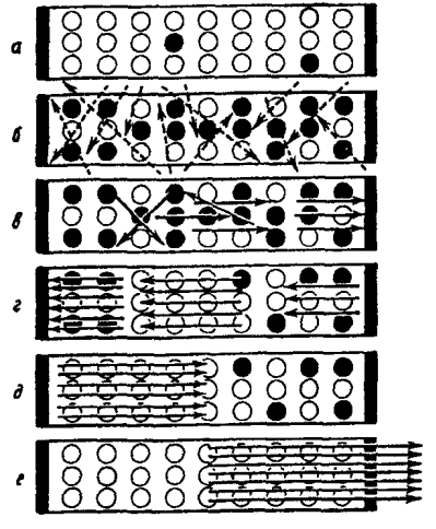 Испускаемые веществом фотоны, попадая на полупрозрачное зеркало, частично проходят сквозь него. Остальные отражаются и летят в противоположном направлении, затем отражаются от левого зеркала (теперь уже все) и вновь достигают полупрозрачного зеркала. При этом поток фотонов после каждого прохода через возбужденное вещество многократно усиливается. Усиливаться, впрочем, будет только та волна, которая перемещается перпендикулярно зеркалам; все остальные, которые падают на зеркало хотя бы с незначительным отклонением от перпендикуляра, не получив достаточного усиления, покидают активное вещество через его стенки. В результате выходящий поток имеет очень узкую направленность. Именно такой принцип получения стимулированного излучения лежит в основе действия лазеров (само слово лазер составлено из первых букв английского определения light amplification by stimulated emission and radiation, что означает: усиление света посредством стимулированного излучения). Созданию этого замечательного устройства предшествовала долгая история. Любопытно, что изобретением лазера техника обязана специалистам на первый взгляд далеким как от оптики, так и от квантовой электродинамики, а именно - радиофизикам. Однако в этом есть своя глубокая закономерность. Прежде уже говорилось, что с начала 40-х годов радиофизики всего мира трудились над освоением сантиметрового и миллиметрового диапазона волн, поскольку это позволяло значительно упростить и уменьшить аппаратуру, особенно антенные системы. Но вскоре обнаружилось, что прежние ламповые генераторы едва ли можно приспособить для работы в новых условиях. С их помощью с трудом удавалось генерировать волны в 1 мм (при этом частота электромагнитных колебаний в этих генераторах достигала нескольких миллиардов за одну секунду), но создание генераторов для еще более коротких волн оказалось невозможным. Необходим был принципиально новый метод генерации электромагнитных волн. Как раз в это время советские радиофизики Александр Прохоров и Николай Басов занялись изучением очень интересной проблемы - поглощением радиоволн газами. Еще во время войны было обнаружено, что волны некоторой длины, испущенные радаром, не отражаются, как другие, от окружающих предметов и не дают "эха". Например, пучок волны длиной 1, 3 см словно растворялся в пространстве - оказалось, что волны этой длины активно поглощаются молекулами водяного пара. Позже выяснилось, что каждый газ поглощает волны определенной длины таким образом, словно его молекулы как-то "настроены" на него. От этих опытов был только шаг до следующей идеи: если атомы и молекулы способны поглощать волны определенной длины, значит, они могут и излучать их, то есть выступать в роли генератора. Так родилась мысль создать газовый генератор излучения, в котором бы вместо электронных ламп в качестве источников излучения использовались миллиарды молекул особым образом возбужденного газа. Перспективы такой работы казались очень заманчивыми, поскольку возникала возможность освоить для нужд радиотехники не только диапазон микроволновых волн, но и гораздо более коротких, например, диапазон видимых волн (длина волн видимого света 0, 4-0, 76 микрон, что соответствует частоте порядка тысяч миллиардов колебаний в секунду). Важнейшая проблема на этом пути заключалась в том, как создать ак