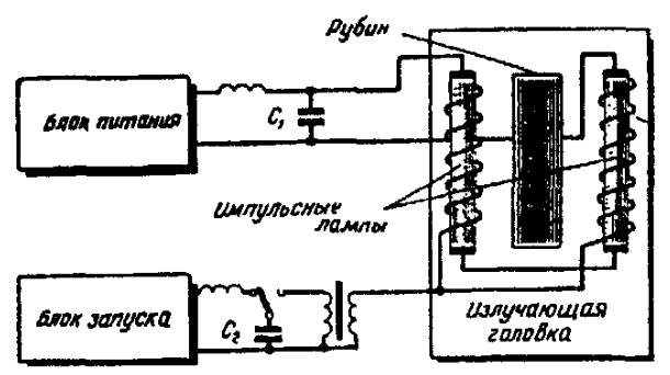 Сущность работы лазера на рубине состоит в следующем. Энергия от источника питания преобразуется источником возбуждения в электромагнитное поле, которым облучается активное вещество. В результате этого облучения активное вещество переходит из состояния равновесия в возбужденное состояние. Внутренняя энергия активного вещества значительно возрастает. Этот процесс носит название "накачки" или "подкачки" активного вещества, а источник возбуждения называется источником "накачки" или "подкачки". Когда атомы активного вещества перейдут в возбужденное состояние, достаточно одному электрону сорваться по каким-либо причинам с верхнего уровня, чтобы он начал испускать фотон света, который, в свою очередь, сбросит несколько электронов с верхнего уровня, чем вызовет лавинообразное выделение энергии остальными возбужденными электронами. Открытый резонатор направит и усилит излучение активного вещества только в одном направлении. В качестве активного вещества Мейман использовал искусственный рубин (рубин представляет собой кристаллическое вещество, состоящее из окиси алюминия, в котором часть атомов алюминия замещена атомами хрома, что особенно важно, так как в поглощении света участвует не весь материал, а только ионы хрома). Генератор возбуждения состоял из трех блоков: излучающей головки, блока питания и блока запуска. Излучающая головка создавала условия для работы активного вещества. Блок питания обеспечивал энергией заряд двух конденсаторов - основного и вспомогательного. Главным назначением блока запуска было генерирование импульса высокого напряжения и подача его на запускающий электрод лампы-вспышки. Излучающая головка состояла из рубинового стержня и двух П-образных ламп-вспышек. Лампы были стандартные, наполненные ксеноном. Со всех сторон лампы и рубиновый стержень охватывала алюминиевая фольга, которая играла роль рефлектора. Конденсатор накапливал и подавал импульсное напряжение порядка 40 тысяч вольт, что вызывало мощную вспышку ламп. Вспышка мгновенно переводила атомы рубина в возбужденное состояние. Для следующего импульса необходима была новая зарядка конденсатора.