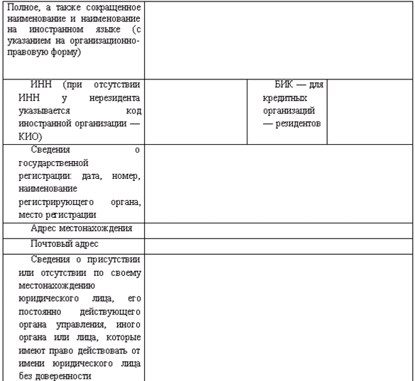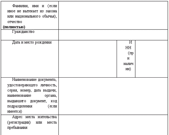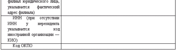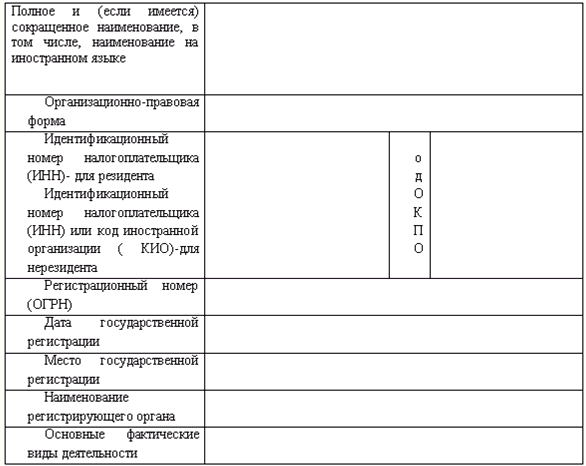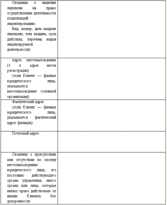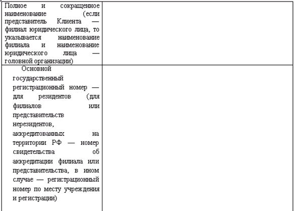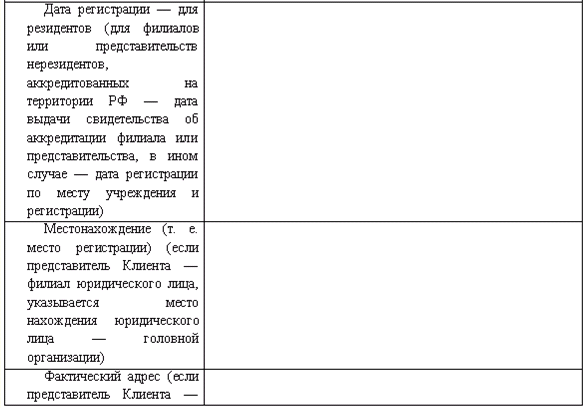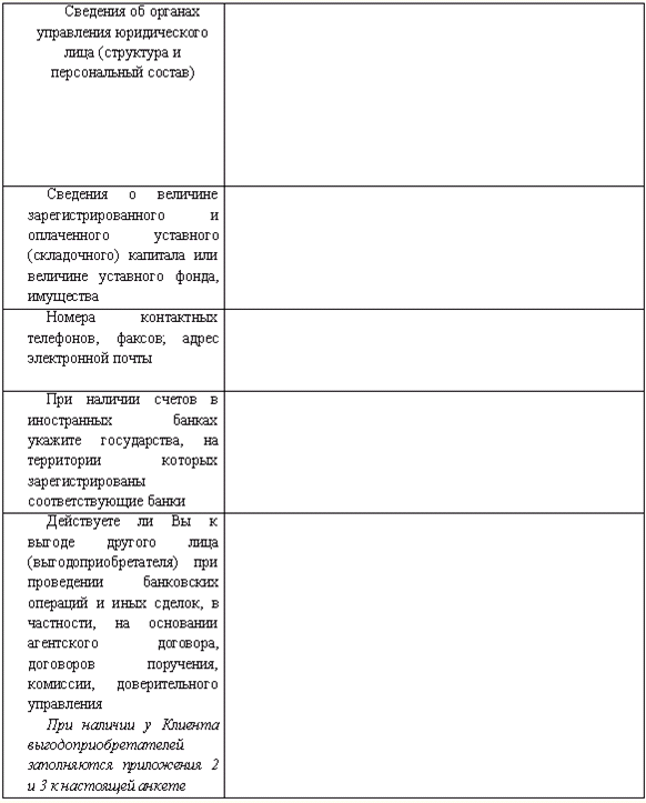 Обязуюсь сообщать обо всех изменениях указанных сведений /___________________________/___________________________________ (подпись) М. П. _____/______________________200___г. (расшифровка подписи) (дата) Примечание. При изменений каких-либо сведений, указанных в анкете, в БАНК (ОАО) представляется заполненная анкета с новыми сведениями. Приложение 1 к анкете Клиента - юридического лица Сведения о представителях Клиента - юридических лицах (в том числе сведения об управляющей компании) Полное и сокращенное наименование (если представитель Клиента - филиал юридического лица, то указывается наименование филиала и наименование юридического лица - головной организации)