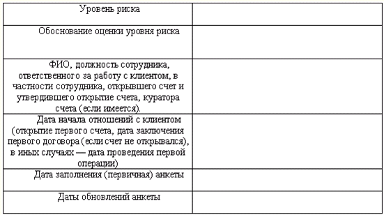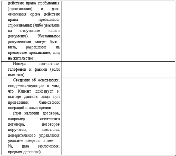 Обязуюсь сообщать обо всех изменениях указанных сведений. Обязуюсь представлять в Банк сведения обо всех выгодоприобретателях. /___________________________/___________________________________ (подпись) М. П. _____/______________________200___г. (расшифровка подписи) (дата) Примечание. При изменений каких-либо сведений, указанных в анкете, в ИНВЕСТСБЕРБАНК (ОАО) представляется заполненная анкета с новыми сведениями Часть 2 (Заполняется сотрудником Банка) _________________________________________ _______________________________________ (ФИО, должность уполномоченного сотрудника, (подпись) заполнившего анкету) Сведения о представителях Клиента - физических лицах (для Клиентов, открывающих или уже имеющих счет в Банке - сведения о лицах, указанных в поле "Первая подпись" карточки с образцами подписей и оттиска печати, в иных случаях - сведения о представителях, действующих от имени Клиента)
