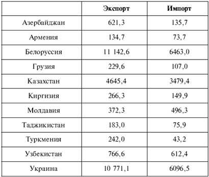 Объемы торговли со странами СНГ в 2004 г. (млн. долларов США):