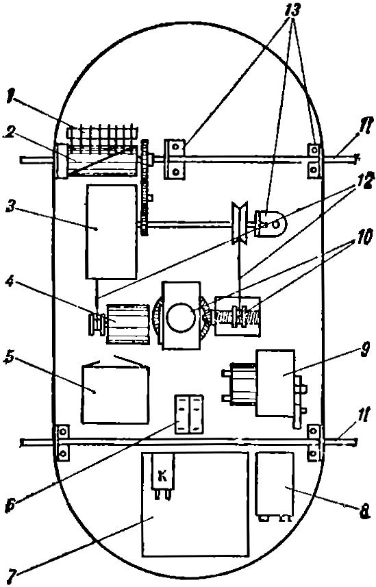 Рис. 1. Компоновочная схема планетохода (нажмите для увеличения): 1 - контакты для лампочек, 2 - контактный валик, 3 - редуктор ведущих колес, 4 - электромоторчик, 5 - батарейка 3336 Л, 6 - блокировочный тумблер, 7 - приемник, 8 - питание приемника (батарейка "Крона"), 9 - исполнительный механизм, 10 - редуктор локаторов, 11 - оси передних н задних колес, 12 - шкивы редукторов, 13 - кронштейны крепления осей