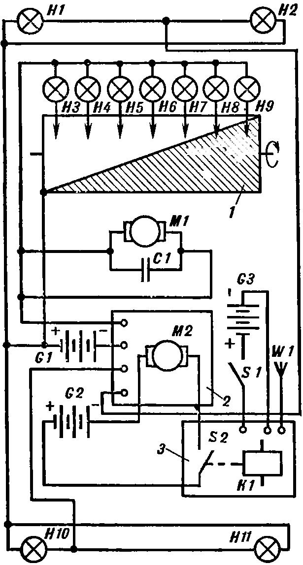 Для управления моделью на ее платформе установлен приемник с исполнительным механизмом, который поочередно включает команды. Здесь же находится батарея питания приемника и тягового двигателя.