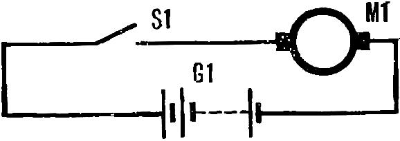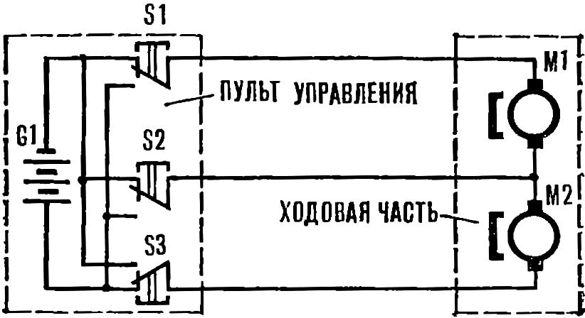 Электрическая схема: M1 - левый двигатель, М2 - правый двигатель, S1 - переключатель "поворот направо", S2 - переключатель "задний ход", S3 - переключатель "поворот налево".