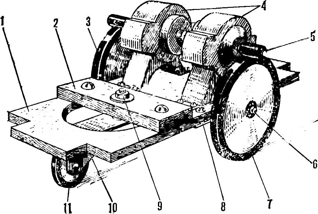 Ходовая часть модели (нажмите для увеличения): 1 - рама, 2 - опорная планка, 3 - резиновое кольцо, 4 - микродвигатели, 5 - резиновая трубочка, 6 - ось, 7 - колесо ведущее, 8 - опорный кронштейн, 9 - крепление оси поворотной вилки, 10 - поворотная вилка, 11 - колесо.
