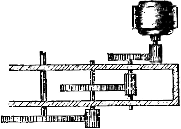 Механический привод "Галактики" состоит из микродвигателя с редуктором, сделанным из старого будильника; он приводит в движение пару колес. Через второй редуктор, на который движение передается через пассик от вала первого редуктора, вращается антенна локатора.