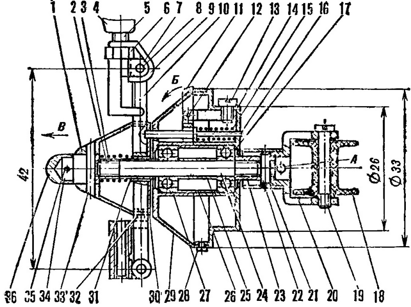 В момент запуска модели ступица 10 воздушного винта вместе с коком 1 подается вперед (по стрелке В) на 2,5-3 мм, в таком положении стопор 16 уже не работает. Пружина 3 сжимается и удерживается так практически до последних оборотов резиномотора за счет сил трения, возникающих от крутящего момента, который передается от ролика 18, через вилку 20, штифт 22, резьбовые втулки 23 и 2 (с пазом), вал 24, штифт 33, кок 1 на ступицу 10 воздушного винта. Когда крутящий момент падает почти до нуля, пружина 3 возвращает кок 1 и ступицу 10 в исходное положение и подкрученный стопор 16 обеспечивает плавное стопорение воздушного винта в строго определенном положении. Длину пружин 3 и 15 надо уточнить при опробовании работы носовой бобышки, при этом осевое усилие первой пружины должно быть несколько больше (на 0,1 кг) осевого усилия второй пружины. При необходимости их длину можно укоротить шлифовкой торцов на наждачном круге.
