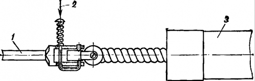 Рис. 2. Накручивание резиномотора со снятым воздушным винтом: 1 - крючок дрели, 2 - кнопка крючка дрели, 3 - носовая часть фюзеляжа