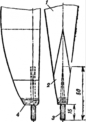 Рис. 4. Комель лопасти воздушного винта: 1 - лопасть воздушного винта, 2 - вставка из липы, 3 - стальной стержень с резьбой М3, 4 - нитки с клеем.