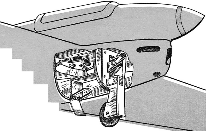 Амортизирующие пружины из проволоки ОВС навиваются на оправке, диаметр которой следует выбирать на 1,5 мм меньше истинного внутреннего диаметра пружины. Далее ненужные витки обрезаются, и в заключение термообработка - закалка и отпуск. Аналогично приводному коромыслу из материала Д16Т вытачиваются и качалки - управления и приводная. Для изготовления колеса потребуется пресс-форма. Ее можно выточить из материала Д16Т. Ступица колеса - из того же сплава. Для более надежного контакта с резиной ее необходимо подвергнуть пескоструйной или химической обработке. Подготовленную таким образом ступицу и сырую резину закладывают в пресс-форму и вулканизируют. Все винты и оси механизма - из стали У8 или 30ХГСА с последующей термической обработкой. Теперь можно приступить к контрольной сборке узлов шасси. В первую очередь из трех фанерных пластин склеивается шпангоут. Учтите, что направление волокон на средней пластине должно быть перпендикулярным к направлениям волокон на внешних. При соединении заготовок лучше всего пользоваться клеем К-153, состоящим из двух компонентов - смолы и отвердителя. Для приготовления его компоненты смешиваются в соотношении 6:1. Готовый шпангоут обрабатывается по контуру фюзеляжа с занижением на 1 мм на сторону. После этого на него устанавливается рама шасси - на клею К-153 и четырех заклепках Ø 2 мм. Для облегчения, а также для более прочного сцепления со шпангоутом в раме можно просверлить несколько отверстий. Далее на раму устанавливаются стойка шасси с закрепленными в ней амортизирующими пружинами, кулисой и ограничивающей ее движение шпилькой и приводное коромысло, которое соединяется с пазом кулисы осью Ø 2 мм. Собранный механизм следует проверить на плавность и легкость хода рычагов, после чего можно вклеивать в крыло (на клею К-153) ось с установленной на ней приводной качалкой.