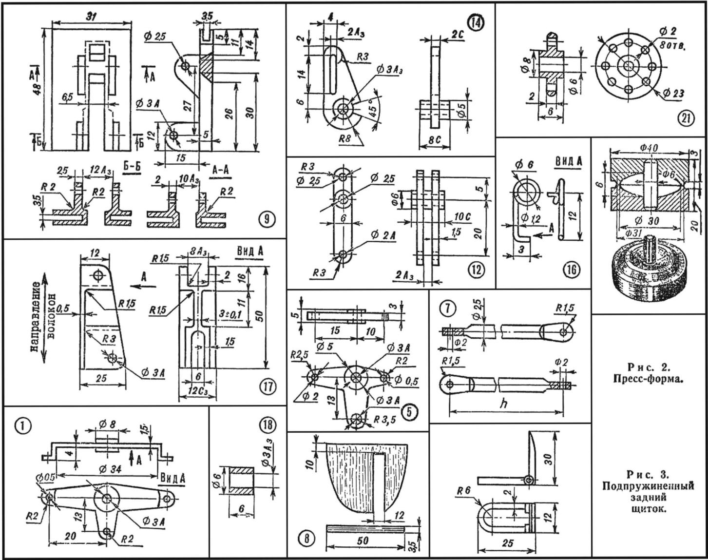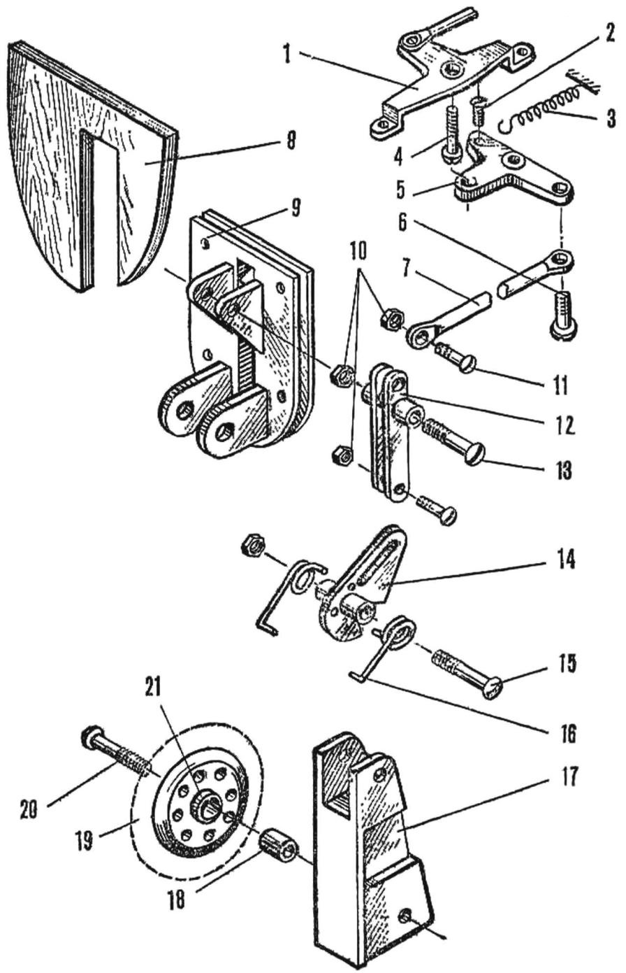 Теперь о некоторых технологических тонкостях. Рама шасси фрезеруется из материала Д16Т. При обработке особое внимание следует обратить на сверление и развертывание отверстий Ø 3 мм и 2,5 мм, разделку пазов шириной 10 и 12 мм, поскольку их непараллельность или несоблюдение упомянутых размеров могут привести к перекосам деталей механизма и отказам в эксплуатации. Стойка шасси - из того же материала. При подборе заготовки не забудьте учесть направление волокон - в противном случае это может привести к потере устойчивости материала под нагрузкой и выходу детали из строя. Кулиса обрабатывается на токарном станке из стали У8 или 30ХГСА, после чего размечаются и фрезеруются паз и наружный контур. И в заключение термообработка. Временной предел прочности материала на разрыв должен быть не меньше 120 кГс/мм2. Приводное коромысло - из сплава Д16Т. Правильный выбор направления волокон и для этой детали имеет существенное значение, так как она является одной из самых нагруженных. Как и кулиса, коромысло сначала вытачивается на токарном станке; максимально точно следует выполнить размеры 10, 2 и Ø 2,5 мм. Далее деталь размечают, в ней сверлят и развертывают отверстия и спиливают ее по наружному контуру.