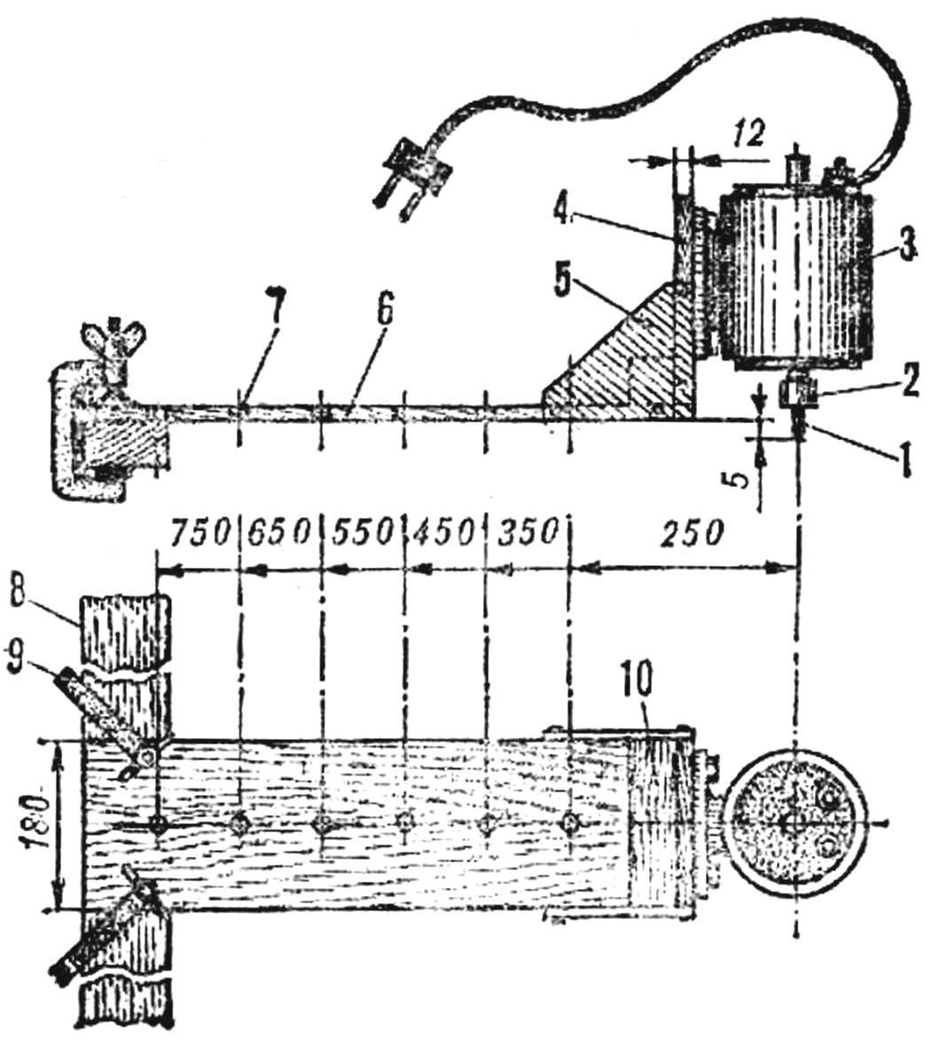 Âàðèàíò îñíàùåíèÿ ïðèñïîñîáëåíèÿ äëÿ ôðåçåðîâêè ïðÿìûõ ïàçîâ ñ èñïîëüçîâàíèåì äåðåâÿííîé ðåéêè (íàæìèòå äëÿ óâåëè÷åíèÿ): 1 - ôðåçà Ø 5 ìì, 2 - ïàòðîí, 3 - ýëåêòðîäâèãàòåëü òèïà ÄÒ-75 (220 Â, 2300 îá/ìèí), 4 - ñòîéêà âåðòèêàëüíàÿ, ôàíåðà 12-ìì, 5 - êðåïåæíûé óãîëîê, 6 - ãîðèçîíòàëüíàÿ ïëîñêîñòü, ôàíåðà 12-ìì, 7 - îòâåðñòèÿ äëÿ ôðåçåðîâêè ðàäèóñíûõ ïàçîâ, 8 - ïëàíêà äëÿ ôðåçåðîâêè ïðÿìûõ ïàçîâ, 9 - ñòðóáöèíû, 10 - äåðåâÿííûé áðóñîê 80õ80 ìì.