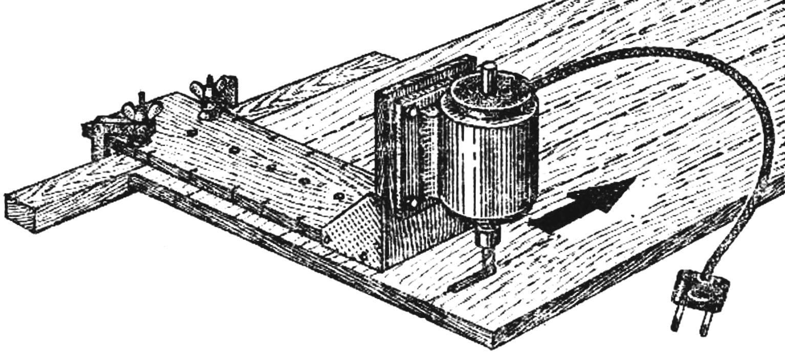 Îñíîâà óñòðîéñòâà - Ã-îáðàçíàÿ êîíñòðóêöèÿ èç ôàíåðû òîëùèíîé 10-12 ìì, ñêðåïëåííàÿ äþðàëþìèíèåâûìè ïëàñòèíàìè è óñèëåííàÿ íà ñòûêå äåðåâÿííûì áðóñêîì. Íà âåðòèêàëüíóþ ñòåíêó áîëòàìè Ì6 êðåïèòñÿ äâèãàòåëü ÄÒ-75 íà 2800 îá/ìèí. Îòâåðñòèÿ äëÿ íåãî ñâåðëÿòñÿ ïî ìåñòó, ïðè÷åì äëÿ íàñòðîéêè ãëóáèíû ôðåçåðîâàíèÿ ëó÷øå äåëàòü èõ îâàëüíûìè. Ïàòðîí äëÿ ôðåçû O 5 ìì ìû âûòî÷èëè èç ëàòóíè è ïîñàäèëè íà âàë äâèãàòåëÿ. ×òîáû ïîëó÷èòü ïàç íåîáõîäèìîé ãëóáèíû, ôðåçà â ïîäãîòîâëåííîì ê ðàáîòå ïðèñïîñîáëåíèè äîëæíà âûñòóïàòü íà 5 ìì çà íèæíþþ ãîðèçîíòàëüíóþ ïëîñêîñòü.