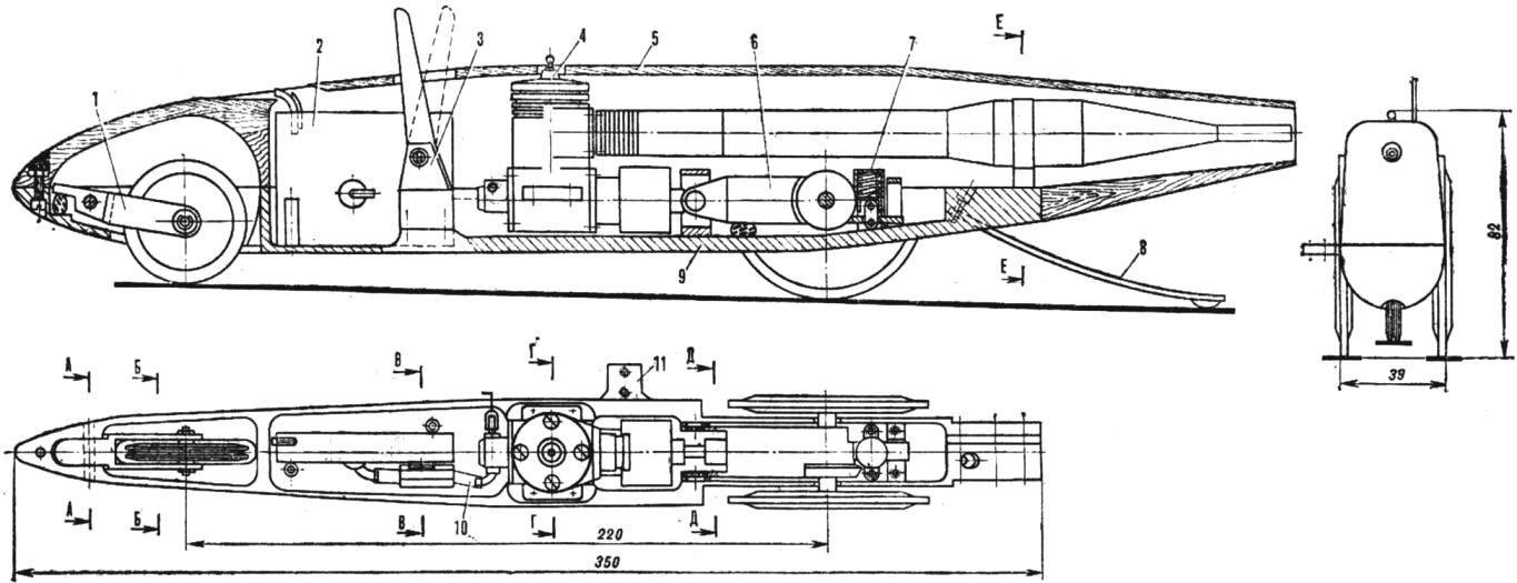 Скоростная кордовая модель 1,5 см3 конструкции В. Кригера (нажмите для увеличения): 1 - передняя подвеска, 2 - топливный бак, 3 -остановочное приспособление, 4 - двигатель, 5 - обтекатель, 6 - редуктор, 7 - амортизатор, 8 - костыль, 9 - поддон, 10 - питающая трубка, 11 - кордовая планка.