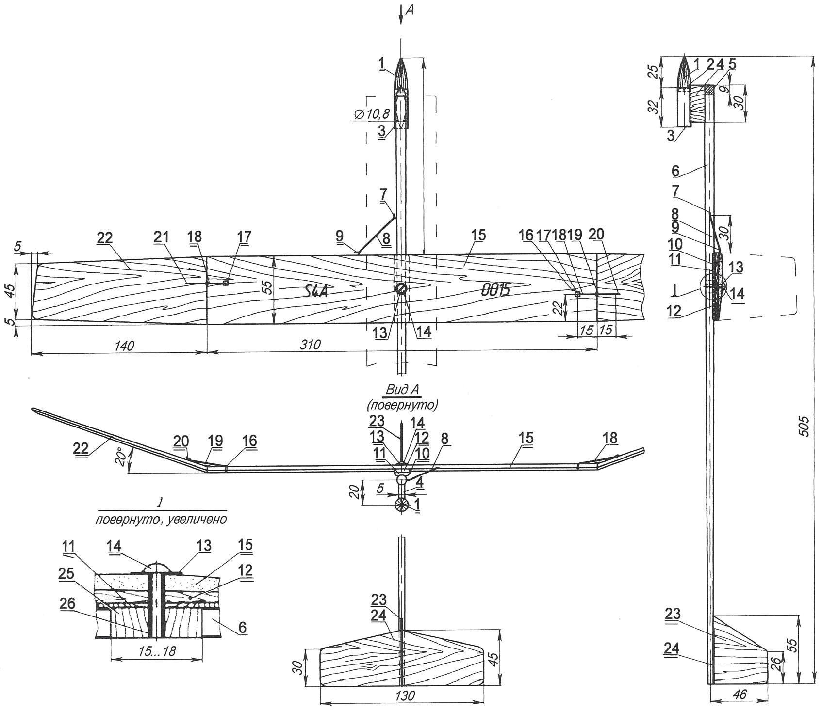 Сколько знаю Алексея (а это более 10 лет), всегда поражаюсь его удивительной скромности и открытости. Его отличает уважительное отношение к юным и взрослым спортсменам-"ракетчикам". По первой просьбе помочь советом или делом - безотказен. По-мужски привлекателен и приветлив, пользуется авторитетом у коллег-педагогов. Все достижения А.Решетникова - результат творческого поиска, стремление сделать что-то новое, неизведанное в маленьком летательном аппарате, называемом моделью ракеты. На страницах журнала уже публиковались чертежи и описания спортивных "снарядов" "ракетчиков" из Сергиева Посада. Полагаю, и предлагаемый сегодня материал будет интересен нашим читателям. С первого взгляда - ракетоплан А.Решетникова (класс S4А) не привлекает внимания спортсменов - обычная "московская" схема. Но при внимательном рассмотрении, особенно - в полете, видишь все особенности конструкции данной модели. Одна из них - большое (по сравнению с другими) удлинение крыла - около 11, а масса ракетоплана всего 18 г. Фюзеляж - конусная балка из углепластика длиной 475 мм, выклеивается на оправке переменного сечения диаметром на концах 7,6 и 3,5 мм. Технология ее формовки такова. Металлическую оправку нагревают и смазывают разделительной мастикой (эдельваксом). Дав остынуть оправке, наматывают на нее слой стеклоткани толщиной 0,03 мм, пропитанной эпоксидной смолой, затем - слой углеткани толщиной 0,14 мм. После непродолжительного высыхания смолы полученную заготовку обматывают магнитофонной лентой шириной 4 - 6 мм и помещают в сушильную камеру (температура от 70 до 80°С). Через 2,5 - 3 часа, дав затвердеть смоле, полученную заготовку освобождают от ленты и, зажав в патрон токарного станка, обрабатывают и торцуют по длине 475 мм. Внутрь балки вклеивают две бальзовые бобышки. Одну - на расстоянии 145 - 150 мм от переднего среза - для "грибка", в которой делают резьбу М2 для крепления крыла. Он же, "грибок", является и осью ее поворота. Другую бобышку вклеивают на расстоянии 90 мм от переднего конца фюзеляжа - для усиления места крепления крючка возвратной резинки. В носовую часть ставят обтекатель из липы и профилируют его как показано на виде сверху чертежа. Затем снизу крепят пилон для контейнера МРД. Он представляет собой бальзовую пластинку толщиной пять мм и размерами 12x30 мм. Спереди пилон заострен по контуру фюзеляжа. Снизу к пилону крепят контейнер МРД - пластиковую трубку длиной 32 мм с внутренним диаметром 10,2 мм и оживальным обтекателем. В месте крепления обтекателя к контейнеру сверлят сквозное горизонтальное отверстие диаметром 1,5 мм. Оно служит для продевания фиксирующей нитки, удерживающей крыло в сложенном виде для взлета, и способствует стравливанию газов при срабатывании вышибного заряда МРД в конце активного участка полета. На расстоянии 152,5 мм от обтекателя фюзеляжа (5) сверху приклеивают на смоле бальзовую пластину длиной 55 мм и шириной 12 мм. Нижнюю ее поверхность профилируют в виде желоба по балке. Затем ее верхнюю плоскость вышкуривают и выравнивают до толщины 1,5 мм - спереди и 1 мм - сзади. После чего покрывают тремя слоями нитролака. Данная пластинка служит посадочной площадкой (11) для пилона крыла (12). В ее середине делают сквозное отверстие диаметром 3 мм и вклеивают в него ось поворота крыла - "грибок" из дюралюминия диаметром 3 мм и длиной 10 мм, с внутренней резьбой М