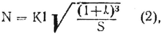 здесь: N - максимальный завод резиномотора в оборотах, Е - первоначальная длина резиномотора в сантиметрах, λ - максимальное относительное удлинение по данным характеристики резины или полученное опытным путем, S - суммарное сечение нитей резиномотора в см2, К - некоторый опытный коэффициент