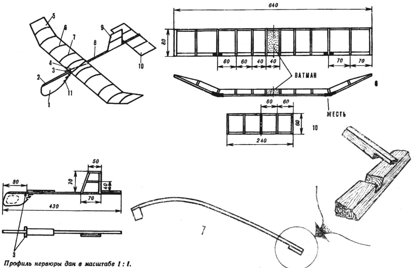 Ìîäåëü ïëàíåðà êîíñòðóêöèè Ñ. Áàêøååâà (íàæìèòå äëÿ óâåëè÷åíèÿ): 1 - íîñîê, 2 - ôþçåëÿæíàÿ ðåéêà, 3 - øòèôò, 4 - ïëîùàäêà äëÿ êðûëà, 5 - çàêîíöîâêà êðûëà, 6 - êðûëî, 7 - íåðâþðà êðûëà, 8 - õâîñòîâàÿ áàëêà, 9 - êèëü, 10 - ñòàáèëèçàòîð, 11 - êðþ÷îê äëÿ çàöåïêè ëååðà