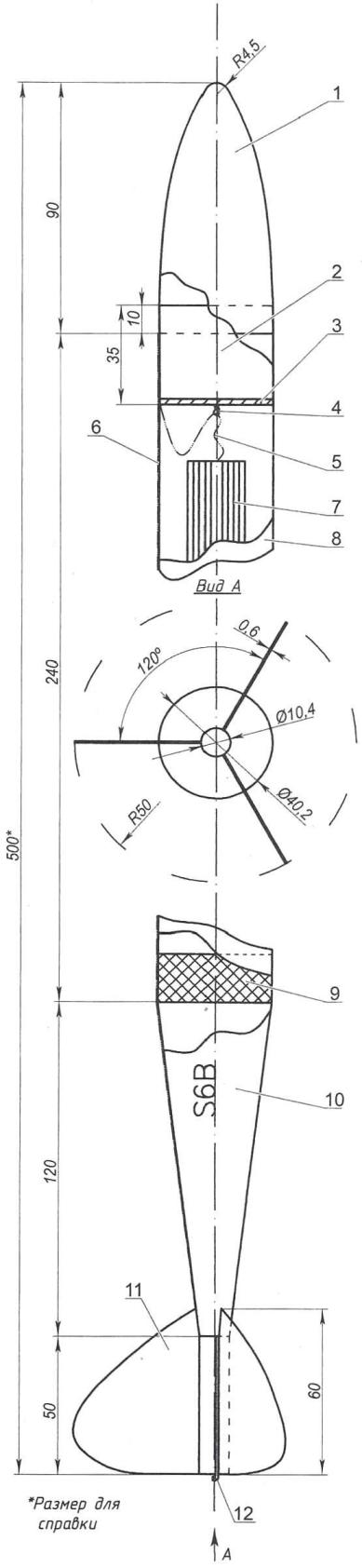 Хорошим подтверждением вышесказанному являются тормозные ленты чемпионов мира 2006 г. среди взрослых - польских спортсменов. Размеры их таковы: длина - 1050 мм, ширина - 97 мм, шаг "гармошки" - 4 - 5 мм, толщина пленки - 0,02 мм. В программу мировых первенств старты категории моделей с лентой (S6) были включены в 1978 году. Это был третий по счету чемпионат мира и первый, в котором дебютировали советские спортсмены. Единственную медаль - бронзовую завоевал тогда автор этих строк. С той поры призерами, но не чемпионами становились в разные годы наши спортсмены: Олег Белоус, Виктор Кузьмин, Юрий Фирсов, Сергей Ильин и Олег Воронов. На проходившей в 1997 г. первой Всемирной Икареаде - своеобразных олимпийских играх по авиационным видам спорта чемпионом в категории (S6) стал Николай Цыганков. В настоящее время категория модели с лентой самая популярная. Именно в ней всегда участвует наибольшее число спортсменов. И эта категория включена в программу всех этапов розыгрыша Кубка мира. Сегодня рассказ о моделях-чемпионах в категории (S6). Предлагаемая модель ракеты класса S6В (рис. 1) разработана конструктором Александром Тарасовым (г. Югорск). Этот класс спортивных моделей с двигателем до 5 н.с. уже много лет имеет право "гражданства" на чемпионатах. Корпус формуют как одно целое на одной оправке с наибольшим диаметром 39,9 мм. Толщина применяемой стеклоткани - 0,03 мм, намотка - в два слоя. Перед формовкой стеклоткань отжигают, а оправку слегка нагревают и смазывают разделительной мастикой ("Эдельваксом"), Во избежание возникновения воздушных пузырей между слоями при накатке еще сырую заготовку обматывают магнитофонной лентой шириной 10 - 12 мм и помещают в сушильный шкаф с температурой 60 - 70°С.