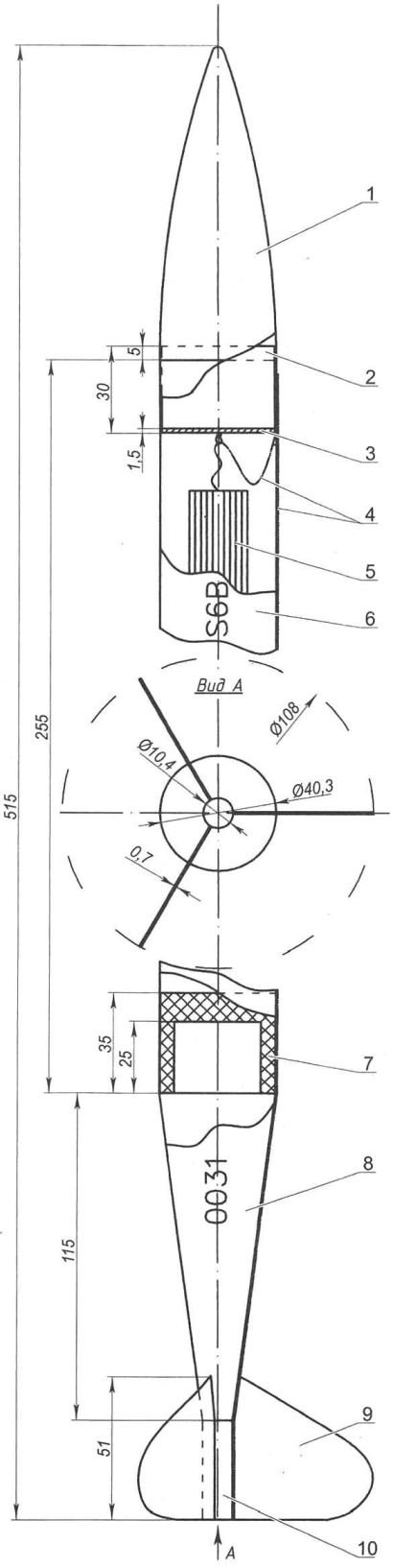 Корпус изготовлен из двух слоев стеклоткани трехсоточной толщины на оправке переменного сечения, максимальный диаметр которой - 39,9 мм, минимальный - 10,2 мм. На этой части оправки накатывается цилиндрическая часть - двигательный отсек из трех слоев. Первый - из углеткани, а потом два слоя стеклоткани. Это делается с целью улучшить термостойкость кормовой части корпуса. В процессе накатки в смолу добавляется и красящий пигмент. Дав полимеризироваться смоле, оправку с намотанной заготовкой зажимают в токарный станок и обрабатывают наружную поверхность, после чего острым резцом обрезают до нужной длины - 425 мм. Затем оправку слегка нагревают и снимают с нее готовый корпус. По такой технологии формуют и головной обтекатель длиной 85 мм. Внутрь обтекателя крепят три бальзовых шпангоута (для жесткости), после чего снизу вклеивают кольцо - соединительную втулку, выточенную из бальзы, шириной 16 мм. Ширина пояска вклейки - 4 мм. В донный шпангоут закрепляют петлю для соединения обтекателя с корпусом посредством нити подвески. Стабилизаторы (их три) вырезаны из бальзового шпона толщиной 1,1 мм, боковые поверхности армированы "стеклом". К корпусу их клеят встык. Вдоль линии приклейки одного из стабилизаторов крепят нить подвески. Тормозная лента имеет размеры: 1050х97 мм, материал - полиграфический лавсан толщиной 0,02 мм. Укладка - "гармошкой" с шагом 4 - 5 мм. Оригинально изготовлен у польских ракетчиков пыж. В отличие от других спортсменов, это не банальный кусочек ваты или пенопластовый цилиндр, а целая бумажная конструкция. Основа ее - трубка из писчей бумаги длиной 265 мм и диаметром - 10,2 мм. На одном ее конце приклеен бумажный диск (глухой - без отверстий), на который "посажен" цилиндр длиной 30 мм. На расстоянии 100 мм от диска на трубку надет еще один диск - для устойчивого размещения пыжа в корпус модели. Преимущество такой конструкции пыжа очевидно. Масса его - 1,5 г. Он не позволяет опускаться вниз системе спасения модели и в момент старта, и в полете. Этим самым не изменяется положение центра тяжести модели. Подготовка модели к полету происходит в таком порядке. Вначале сверху опускают пыж вниз до появления нижнего его конца за кормовой срез корпуса. В трубку пыжа вставляют верхнюю часть двигателя на ширину 2-3 мм, закрепляют его в двигательном отсеке. Далее сверху укладывают систему спасения (тормозную ленту или парашют) и крепят головной обтекатель. В полете, после срабатывания вышибного заряда МРД, энергетический импульс (взрывная волна) передается по трубке (в малом диаметре - 10,2 мм) и упирается в диск пыжа. Он перемещается вверх и выбрасывает из корпуса систему спасения. При этом может вылетать и сам. Автор: В.Рожков