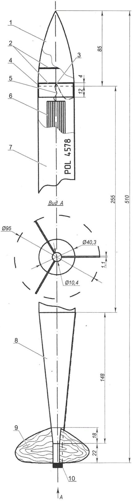 После высыхания смолы полученную заготовку обрабатывают напильником. Потом обрезают остроотточенным резцом до нужной длины. Стабилизаторы вырезают из обработанной и армированной стеклотканью бальзовой пластины толщиной 0,6 мм. В пакете (по 3 шт.) доводят по контуру до нужной формы и крепят встык к двигательному отсеку корпуса. К одному из стабилизаторов, предварительно обмотав нитками со смолой, приклеивают фиксатор МРД - отрезок проволоки ОВС диаметром 0,8 мм с загнутым и выступающим за срез корпуса на 6 - 7 мм концом. К другому стабилизатору крепят нить подвески. Головной обтекатель со слегка закругленной вершиной (радиус округления - 4,5 мм) формуют аналогично корпусу. Соединительная втулка - отрезок стеклопластиковой трубки длиной 35 мм с внешним диаметром 39,9 мм вклеивают одним концом в нижнюю часть (юбку) обтекателя. В другой конец втулки вклеивают бальзовый шпангоут с петлей, соединяемой с нитью подвески. К ней же привязывают и нить крепления тормозной ленты. Стример (тормозная лента) - размерами 1550x150 м - из жесткой лавсановой пленки толщиной 0,024 - 0,03 мм. Масса модели без МРД и тормозной ленты - 7 г. Спортивная модель ракеты кпасса S6В (рис. 2) чемпиона России С.Романюка (г. Урай) - типичный представитель летательных аппаратов так называемой "уральской" схемы, автором и разработчиком которой является коллектив ракетомоделистов г. Челябинска под руководством заслуженного тренера России В.И.Тарасова. Модель изготовлена по достаточно известной технологии. Корпус - стеклопластиковая трубка переменного сечения максимальный наружный диаметр - 40,3 мм, минимальный - 10,4 мм. Материал - стеклоткань толщиной 0,03 мм в два слоя и эпоксидная смола ЭД-6. После отверждения связующего оправку с заготовкой корпуса обрабатывают в токарном станке (при 600 - 700 об/мин) и обрезают до необходимой длины - 405 мм. Затем оправку слегка нагревают и снимают с нее готовый корпус. По той же технологии формуют головной обтекатель и соединительную втулку длиной 30 мм. Ее вклеивают в юбку обтекателя на глубину 5 мм, предварительно обезжирив его внутреннюю поверхность. Другой (торцевой) конец втулки закрывают бальзовым шпангоутом толщиной 1,5 мм, в который вклеивают петлю из крепкой нитки. К ней затем привязывают нить подвески корпуса и системы спасения. Стабилизаторы изготавливаются из бальзовой пластины толщиной 0,7 мм, боковые поверхности их оклеены стеклотканью на эпоксидной смоле. К корпусу они приклеены встык. К одному стабилизатору крепят кевларовую нить подвески. Тормозная лента (стример) вырезана из полиграфической лавсановой пленки толщиной 0,025 мм, ее размеры - 1450x110 мм. Масса модели без стримера и МРД -10 г. "Универсал" польских спортсменов (рис.З). Такое встретишь не часто. Должен сказать, что на моей памяти это впервые. Оба чемпиона в одном классе (S6А) среди юношей и среди взрослых из одной команды - Польши. Но и это не все. Они - Михал Кумар и Лешик Малмуга - ученик и тренер. Такому творческому содружеству можно только порадоваться. Да и их спортивные "снаряды" - модели ракет вызвали большой интерес у участников и специалистов 16-го чемпионата мира на Байконуре. На первый взгляд, вроде ничего особенного. Обычная, традиционная конструкция. Но есть в ней то, что, на мой взгляд, заслуживает внимание. Тем более этот спортивный "снаряд" стоит на "вооружении" польских спортсменов в д