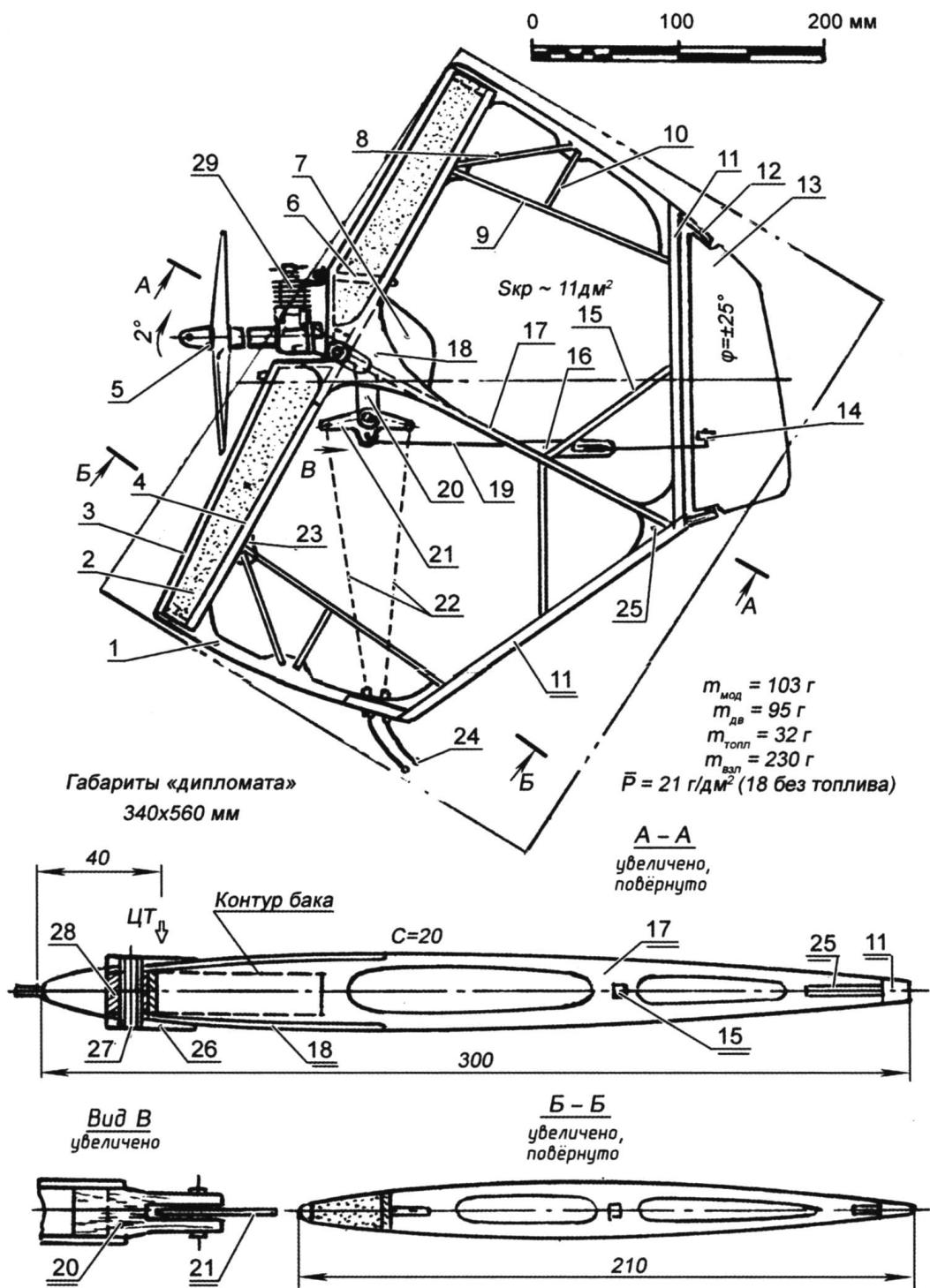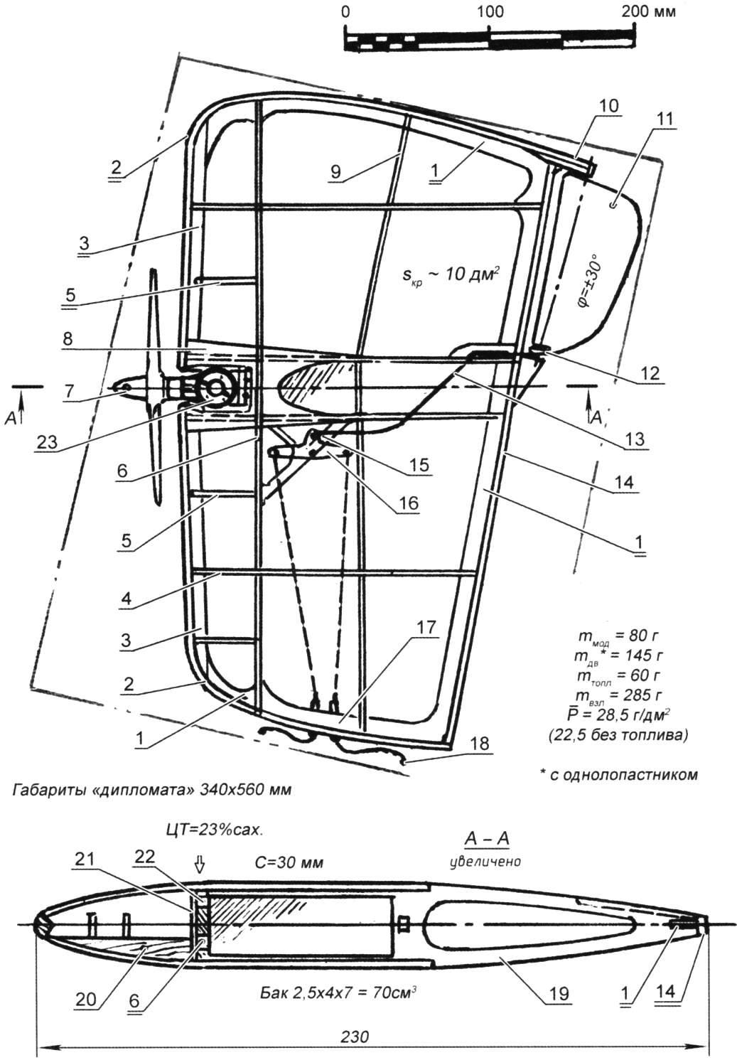 Когда стали понятны причины неудачи с первой компактной "бойцовкой", была создана вторая "дипломатная" модель, но уже рассчитанная под двигатель МК-17. За время, потребовавшееся для анализа кинематики системы управления, появились новые идеи, которые и нашли воплощение в новой конструкции, созданной именно для соревнований. Кроме повышенной скорости и хорошей маневренности, второй вариант "бойцовки" также должен был обеспечивать очень высокую надежность взлета без стремления ухода в круг и дополнительно увеличивать вероятность захвата и отруба ленты модели соперника. Последнего удалось добиться резким "перекосом" крыла, в результате чего произошло выгодное для натяжки корд перераспределение несущих площадей между левым и правым полукрыльями (относительно оси, проходящей через вал воздушного винта). А отруб ленты теперь осуществлялся не только при попадании его на вращающийся пропеллер, но и в случае захвата скошенной передней кромкой левого полукрыла. Лента, перегнувшись через кромку, самостоятельно сдвигалась к центру "бойцовки" и там рубилась винтом или рвалась, попав на дренажную трубку или крепление двигателя. Отметим, что предложенное решение соответствует правилам, запрещающим иметь специальные устройства для отруба ленты: в нашем случае их нет, а обрыв за счет попадания на крепление мотора вполне вероятен и на обычной технике при определенной манере оперирования пилота с кордами после перегиба ленты через переднюю кромку. Мы же лишь увеличили вероятность подобного отруба-отрыва, доведя атакующую ширину захватной зоны почти до 300 мм (вместе с диаметром винта). В последнем исполнении "бойцовка" стала еще проще и, так же как и первая, укладывается в "дипломат", правда, со снятым двигателем. Летные испытания дали хорошие результаты на всех режимах и при любых атмосферных условиях. Конечно же, при надежной работе "сердца" модели - двигателя. Автор: В.Тихомиров