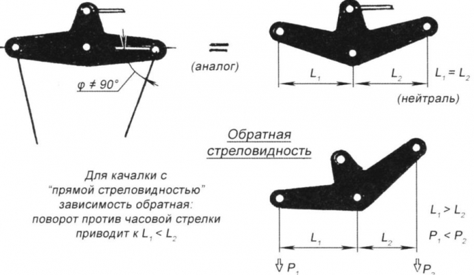 Неудачным надо признать выбор направления выкоса оси поворота руля высоты. При работе в обе стороны в условиях обдува на нем возникает аэродинамический момент силы, направленный в круг. Однако расчеты показали, что величина этой силы пренебрежимо мала по сравнению с другими факторами; так что выкос выбирался по чисто технологическим соображениям (при иной конструкции каркаса выгоднее было бы поставить руль перпендикулярно направлению полета или даже с выкосом в обратную сторону). Предварительные прорисовки показали, что при вполне приемлемой величине удельной нагрузки на несущую площадь получается настолько компактная модель под двигатель МАРЗ-2,5 (или иной, подобного типа), что она без проблем размещается без разборки в чемоданчике типа "дипломат". Впоследствии это очень упростило поездки на полеты. Постройка первого варианта "бойцовки" не представляет трудности для моделистов любого уровня. Поэтому останавливаться на технологии ее изготовления нет особого смысла. Замечу лишь: для усложнения условий эксперимента мотор был форсирован до уровня среднего по качеству двигателя типа КМД (при работе на высоких оборотах с легким винтом) и одновременно сильно облегчен. Центровка задавалась в общепринятых границах; углы отклонения небольшого по площади руля высоты увеличены в связи с его малым плечом и... уверенностью: богатый опыт пилотирования экстремальных аппаратов в любом случае позволит справиться и с этой техникой. Первые же полеты необычной "бойцовки" дали удивительные результаты. При стандартной длине корд около 16 м взлет столь малоразмерной и легкой модели проходил идеально, вне зависимости от направления и силы броска. Далее "бойцовка" быстро набирала скорость, и... в горизонтальном полете начинало твориться что-то непонятное. Создавалось впечатление, что кто-то систематически дергал то за верхний, то за нижний корд: модель постоянно "танцевала", и ее полет приходилось корректировать значительным отклонением рулей. На фигурах поведение ее немного стабилизировалось, но после возвращения к горизонтальному полету эффект возникал снова. Сразу же появилась мысль: неустойчивость связана с излишне задней центровкой. Поэтому для увеличения массы носовой части был смонтирован однолопастный воздушный винт с противовесом и одновременно заменен руль высоты. При такой же площади он стал в три раза легче, причем щель между рулем и задней кромкой крыла увеличилась в два раза. Однолопастный винт, кроме прочего, обладает почти в два раза меньшим моментом инерции, что обещало снижение и возможное влияние гироскопического момента. В результате доработок центровка сдвинулась вперед почти на 10%. Тем не менее, результат доработок оказался нулевым: модель летала точно так же, как и вначале. На взлете и разгоне - идеально, после набора скорости - хуже не придумаешь. Надо признаться, головоломка для человека, хорошо знакомого с аэродинамикой, та еще. На некоторое время "бойцовка" была отложена, так как нужно было прежде всего разобраться в причинах происходящего. А на данном этапе это и было наибольшей проблемой. "Просветление" пришло значительно позже... Оказалось, все дело отнюдь не в аэродинамике, а в системе управления. Секрет заключался в непараллельности тросиков, подходящих к качалке управления. В переводе на обычные условия со