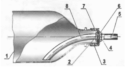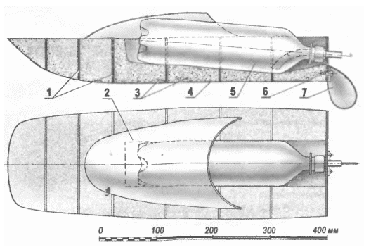 Чтобы превратить бутылку в двигатель, достаточно оснастить ее специальным штуцером, который одновременно выполняет и функцию реактивного сопла. Бутылка, заполненная приблизительно на 2/3 водой, устанавливается в специальное гнездо в корпусе судомодели и с помощью автомобильного насоса заполняется сжатым до нескольких атмосфер воздухом. Далее модель ставится на воду, штуцер освобождается от наконечника автомобильного насоса - и реакция струи воды из сопла разгоняет глиссер до вполне приличной скорости. Для небольшого глиссера простейшей конструкции длиной около 600 мм основой гидропневматического водомета может стать бутылка емкостью 1 л - длина ее обычно составляет около 325 мм и диаметр около 80 мм. Для штуцера вполне подойдет металлическая (лучше дюралюминиевая) трубка длиной около 140 мм с внешним диаметром 8 мм и толщиной стенки 1 мм. С одного конца трубки нарезается резьба М8х0,5; понадобятся также две гайки с такой же резьбой для крепления штуцера в бутылочной пробке. Герметизация соединения осуществляется в помощью двух шайб и автомобильного самотвердеющего герметика. Та часть штуцера, которая находится внутри бутылки, имеет изогнутую форму - это позволяет практически полностью использовать так называемое "рабочее тело" - в данном случае залитую в пластиковый баллон воду. Сама же судомодель представляет собой своего рода тримаран, собранный по упрощенной технологии из пенопласта марки ПС и фанерных шпангоутов.