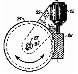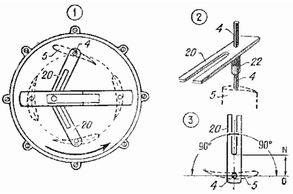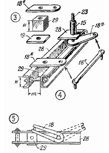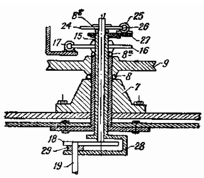 В такой модели (рис. 9) для перемещения пальца 19 в положение над центром движителя (то есть для того, чтобы у лопастей не было упора и судно останавливалось) или для перемещения в какое-то промежуточное положение между крайним и центральным (чтобы изменить угол атаки лопастей и величину упора), рулевой вал 15 также делают трубчатым и сквозь него пропускают регулировочный вал 23, на верхнем конце которого насажено червячное колесо 24, приводимое во вращение вторым небольшим электродвигателем 25 с помощью червяка 26 (рис 10). На нижнем конце регулировочного вала 23 крепят кронштейн 28, в котором палец 19 эксцентрика перемещается с помощью ползунка 29. Эксцентрик 18 делается составным. Рулевой вал 15 поворачивает эксцентрик вместе с кронштейном 28, а при повороте регулировочного вала 23 эксцентрик 18а начинает поворачиваться и перемещать ползунок 29 с пальцем 19 по кронштейну 28, устанавливая его в нужное положение (рис. 11, 1-4). Для упрощения эксцентрик 18 можно сделать не составным, а в виде вилки (рис. 11, 5).