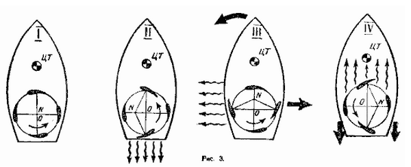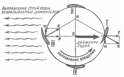 При вращении диска движителя лопасть входит в воду под каким-то углом к касательной к данной точке окружности диска, и на нее будет давить вода с силой R, которую по правилам параллелограмма сил можно разложить на две составляющих силы (рис. 2, I): P - силу упора лопасти, направленную наружу от центра диска, и W - силу лобового сопротивления лопасти. Направление отбрасываемой движителем струи воды противоположно силе упора. В точке III (рис. 2) создастся аналогичное положение, только угол атаки лопасти будет отрицательным, а поэтому сила упора будет направлена к центру движителя О и будет складываться с силой упора первой лопасти, создавая полный упор движителя, двигающий судно и всегда направленный перпендикулярно отрезку ОN. В точках (рис. 2,II и IV) плоскости лопасти будут расположены параллельно касательной к окружности диска и не создадут силы упора. Точку управления N с помощью специального устройства можно установить в любое положение по отношению к центру диска движителя О, изменяя этим самым направление отбрасываемой движителем струи воды, а следовательно, и упора движителя. Если поставить точку N над центром движителя О (рис. 3, 1), то плоскости всех лопастей будут расположены параллельно касательным к окружности диска, проведенным в точках, где проходят оси лопастей. Сила упора в этом случае равна нулю, и, несмотря на то, что диск движителя будет вращаться, судно не сдвинется с места. Переместив точку N влево от центра О (рис. 3, II), мы даем судну передний ход, переместив вправо (рис. 3, IV) - задний ход, а переместив точку N вперед от центра движителя, мы заставим корму судна двигаться вправо (рис. 3, III) и т. д. Благодаря этому судно с крыльчатым движителем может двигаться вперед и назад и изменять направление своего движения, не имея руля, а если поставить на судно два движителя, то оно сможет перемещаться даже боком.