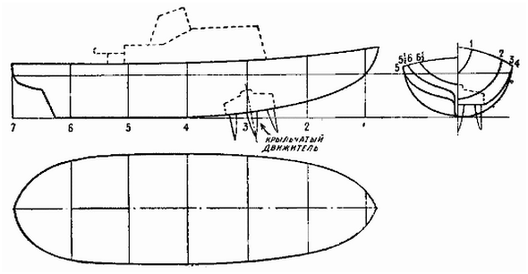 Внимательно рассматривая рисунок 3, можно заметить, что движитель все время вращается в одну и ту же сторону, а судно перемещается в разные стороны. Пользуясь этим свойством движителя, на судах можно устанавливать более простые двигатели - нереверсивные, то есть не меняющие направления вращения. Такие двигатели легче по весу по сравнению с реверсивными, проще по устройству и уходу за ними и значительно дешевле реверсивных. Однако у крыльчатых движителей имеются и недостатки, основным из которых является сложность передачи вращения от двигателя к движителю, благодаря чему двигатели больших мощностей (свыше 5000 л. с.) с крыльчатыми движителями использовать нельзя, а это ограничивает размеры судов, на которых такие движители применяются. Тем не менее основные свойства судов с крыльчатыми движителями - возможность иметь боковой ход, поворачиваться на месте, быстро изменять направление движения - делают такие суда незаменимыми при плавании в "узкостях": в каналах, на реках и в портах. Крыльчатые движители с успехом применяют на речных пассажирских судах, на портовых кранах и буксирах; производятся эксперименты по применению крыльчатых движителей на рыболовных траулерах. На судах крыльчатые движители устанавливаются в местах, которые наиболее удобны для данного типа судна. На пассажирских судах движители устанавливаются в корме, на буксирах - в корме или в носу, на портовых кранах - посередине корпуса. За образец модели судна с крыльчатым движителем можно взять буксир с движителем, установленным в носовой части судна. Такой буксир (теоретический чертеж его приведен на рис. 4) длиной 24,6 м, шириной 7,6 м