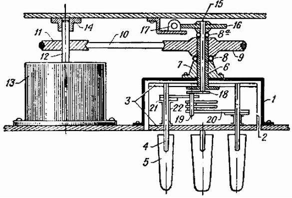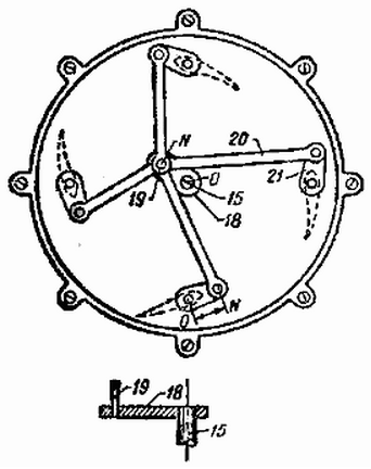 Сквозь трубчатый гребной вал 6 пропущен рулевой вал 15, на котором поверх шкива 9 надето установочное кольцо 8а. На верхний конец рулевого вала насажено червячное колесо 16, приводимое во вращение червячным приводом от маленького электродвигателя 17. Червячная передача подбирается с таким расчетом, чтобы червячное колесо 16, а с ним и вал 15 могли бы делать 8-10 об/мин. Тогда модель сможет изменить ход с "полного вперед" до "полного назад" через 6-8 сек. На нижний конец рулевого вала 15 насажен эксцентрик 18 с пальцем 19. На палец надеты концы тяг 20, идущих к кривошипам 21, поворачивающим лопасти. На оси 4 лопастей 5 надеваются втулки 22, на которых держатся кривошипы. При таком устройстве эксцентрика 18 (рис. 7) модель будет перемещаться вперед и поворачивать в заданном направлении. Изменять же скорость движения и останавливать судно можно, только изменяя число оборотов двигателя или останавливая его.