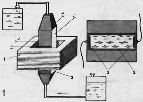 В щели сердечника размещен канал, изготовленный из оргстекла, на противоположных стенках которого приклеены электроды из листовой латуни или меди. Они подключаются к источнику постоянного тока с регулируемым напряжением от 100 до 200 вольт.