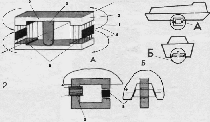 Взгляните на рисунок 2. Детали двигателя аналогичны деталям макета генератора. Стоит опустить его в раствор электролита (а им может быть морская или подсоленная вода), подать напряжение, как в зазор сердечника хлынет поток электролитической жидкости. Он-то и приводит модель в движение.