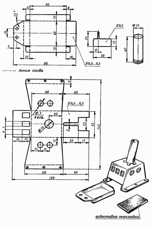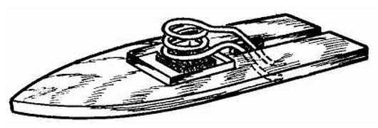 Хорошее использование тепла от сгорания таблетки сухого спирта обеспечивается "рубкой", выгнутой из жести или кровельного железа и являющейся, по сути, корпусом "печки". Между топливным элементом и змеевиком надо оставить по высоте пространство около 10 мм, чтобы дать свободный доступ воздуха к пламени. Внизу "рубки" помещается поддон, который выдвигается вперед при замене спирта, а в рабочем положении лежит на термостойкой асбестовой прокладке. Перед запуском с помощью медицинской "груши" трубка заполняется водой и пароходик ставится на воду. Затем поджигается топливо, и поддон вдвигается на место. При испытаниях модели надо быть осторожным, чтобы не обжечься о раскаленные металлические детали. Двигатель с предложенными габаритными размерами годится для привода в действие любых моделей длиной 150...300 мм. Для отработки мотоустановки можно создать модель-стенд, представляющую собою простейший контур из древесины. И лишь потом приступить к постройке полукопии рыболовецкого катера, какая и приведена на рисунках. При желании вполне допустимо размещение двигателя не в корме микросудна, а посередине его корпуса. Занятно решение универсального типа, когда модель парусника дооборудуется прямоточной мотоустановкой. Конечно, здесь придется решать проблему защиты парусов и рангоута от пламени паровой установки. По материалам журнала "Моделист-конструктор"