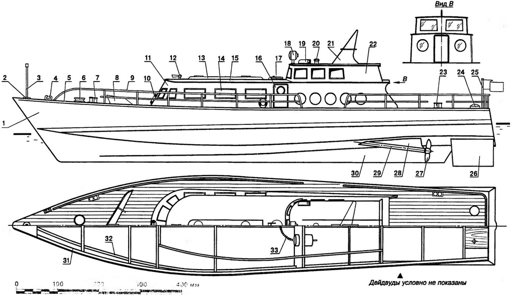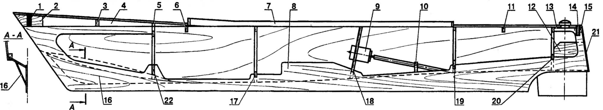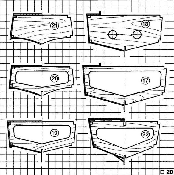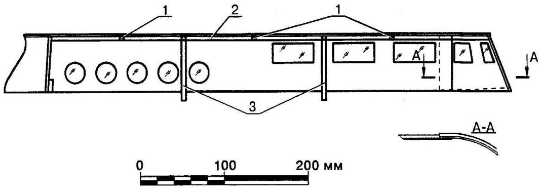Номера выкроек соответствуют позициям рисунка "Конструкция корпуса". Вся внутренняя часть корпуса покрывается тремя слоями двухкомпонентного паркетного лака. В кормовой части со стороны днища размечаются и сверлятся два сквозных отверстия под медные или латунные трубки диаметром 6 мм и под баллеры рулей диаметром 4 мм. Сами рули вырезаются из фанерных пластин толщиной 1,2 мм. Между этими пластинами зажимается баллер, и кромки рулей склеиваются друг с другом. Внутренняя полость заливается эпоксидной смолой. Сечение руля получается чечевицеобразным, симметричным. На свободных концах рулевых валов нарезается резьба М4 под фиксирующие гайки. Поверхность рулей покрывается лаком. Силовая установка собирается на базе двух двигателей постоянного тока типа "Мабучи-380" с противоположным, заданным изготовителем направлением вращения (это необходимо для компенсации реактивного момента при их работе). Источником питания служат серебряно-цинковые (серии СЦС) или никель-кадмиевые аккумуляторы рабочим напряжением 6...8 В и при суммарной емкости не ниже 4,5... 5 А-ч. Дейдвуды используются фирменные или самодельные. Гребные винты диаметром 45 мм - пластмассовые, промышленного изготовления, противоположного вращения. Валы двигателей со стороны коллекторов соединяются между собой стальной пружиной (какие применяются для сальников), которая служит синхронизатором оборотов. Электродвигатели крепятся к моторному шпангоуту хомутами из жести или мягкого листового дюралюминия. Полости дейдвудов должны быть заполнены с помощью шприца консистентной смазкой "Литол" или "Циатим" (необходимо смазать также валы рулей). В кормовой части днища дейдвуды выводятся наружу и фиксируются косынками из фанеры толщиной 5 мм. Изнутри корпуса место выхода каждого дейдвуда усиливается полосками стеклоткани, пропитанными эпоксидным клеем. Палуба выполняется из отборных реек сечением 8x3 мм. Склеивание проводится на листе бумаги или пластиковой пленке. Полученная заготовка с обеих сторон обрабатывается шкуркой. В кормовой части снизу приклеивается накладка из фанеры толщиной 1,2 мм. Затем палуба накладывается на корпус, размечается по месту и выпиливается с небольшим припуском. Далее вырезается люк для доступа к внутренним элементам яхты, который окантовывается по периметру сосновыми рейками или полосками фанеры для предотвращения попадания воды в корпус. Готовую палубу приклеивают к каркасу. После отверждения клея припуск убирается шкуркой. Над гайками фиксации рулей сверлятся два отверстия диаметром 12 мм под торцовый ключ, которые закрываются легкосъемными заглушками из липы. Вся поверхность палубы аккуратно покрывается четырьмя слоями паркетного лака с шлифовкой каждого слоя мелкой шкуркой. Надстройка изготавливается из 1,2-мм фанеры. Стенки и крыша стыкуются с помощью сосновых реек сечением 5x5 мм. Иллюминаторы и окна изнутри заклеиваются прозрачной пленкой толщиной 0,3...0,5 мм. Надстройка и рубка изнутри и снаружи три раза покрываются лаком. Деталировка надстроек и палубы выполняется из различных материалов. Антенна на рубке выпиливается из фанеры толщиной 2 мм; корпуса бортовых фонарей (левого и правого) и волноотбойник - из 1,2-мм фанеры; спасательные круги - из полистирола толщиной 5 мм. Флагштоки изготавливаются из кусков латунной или стальной провол