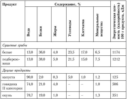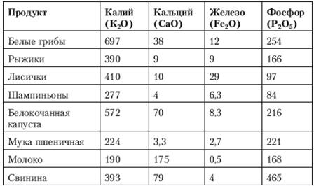 Из минеральных веществ в грибах особенно много калия, фосфора и железа, столь необходимых для организма человека и нередко отсутствующих в других продуктах (табл. 2.5). Таблица 2.5. Содержание минеральных веществ в грибах и некоторых других продуктах питания (мг на 100 г сухой массы)