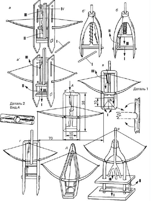 В нижней части рогулька соединена порожком, к которому прижат пружиной давящий стержень Т-образной формы. На внутренних сторонах рогульки вырезаны желобки, по которым свободно передвигается поперечина давящего стержня. Для устойчивости стержня в вершине рогульки просверлено отверстие. Там же привязан на шнурке сторожок. Для настораживания этого самолова пружину сжимают, приподнимают давящий стержень кверху, подхватывая его поперечину коротким плечом сторожка (II), что придает ему вертикальное положение, а чтобы он не вывернулся наружу, конец его упирают в насторожку (I), которой перегораживают в нижней части проход между порожком и поперечиной давящего рычага. Последовательность работы этого черкана почти такая же, как и у предыдущего, с той лишь разницей, что при надавливании на насторожку (I) освобождается свободный конец сторожка (II), который, вывернувшись из-под поперечины, отпускает давящий рычаг. Чувствительность насторожки со сторожком без челака значительно хуже. При очень тугой пружине или тугом луке насторожка может обусловить задержку, что на промысле самых мелких пушных зверьков может привести к проловам. Рамку черкана загибают из целого прута вяза, березы или другого дерева, поддающегося перегибам в распаренном виде. Подбирают прут с одинаковой толщиной (2-3 см) по всей нужной длине, размечают места перегибов и на них делают прорези на 2/3 толщины в виде прямого угла с закругленной вершиной (см. рис. 2.5, в, деталь 1). Хорошо распарив эти вырезы в горячей золе, их загибают. Свободные концы в верхней части рамки соединяют боковыми сторонами, предварительно вырезав в них полуцилиндры по величине, немногим превышающей диаметр стержня давящего рычага. Затем концы с боков обстругивают и соединяют гвоздями или проволокой (см. рис. 2.5, в, деталь 2). В этом черкане челак выполняет двойную роль. Малым плечом он полностью принимает на себя силу лука, а длинным плечом работает как сторожок, на свободный конец которого надета петля от симки, выполняющей роль насторожки. У настороженного капкана натянутые симки (I) перегораживают проход над порожком. Они соединены одной тягой - шнурком с петлей, опоясывающей давящий стержень и свободный нижний конец челака. Зверек, пролезая через порожек, натягивает симки (I) и стягивает петлю (II) с кончика челака (III), который вывертывается и освобождает тетиву, действующую силой натянутого лука на давящий рычаг (II). Черкан на рис. 2.5, г также сделан на основе рамки, загнутой из целого прута. Отличается эта рамка тем, что свободные ее концы скреплены порожком, заострены и опущены вниз. Воткнутые в снег или в землю, они придают черкану нужную устойчивость. Лук привязывают к рамке прочно шнуром или проволокой, так как давящий стержень никаких направляющих и точек опоры не имеет. В остальном настораживание и срабатывание этого самолова такое же, как у предыдущего. Черкан на рис. 2.5, д смонтирован не с рамкой, а с выдолбленным лотком, и давящий рычаг в нем заменен давящей лопаткой. Направляющими для нее служат задняя стенка лотка и середина деревянной части лука. Для движения тетивы в боковых стенках лотка сделаны пропилы. Проход через этот черкан ограничен круглым отверстием, прорезанным в стенке лотка. Настораживается он с помощью челака, сторожка и насторожки. От всех описанных деревянных самоловов черкан, 