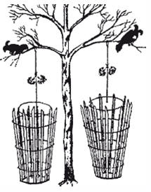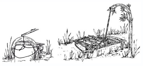 Рис. 2.9. Рогатка (а), бола (б) Копытных при некоторой тренировке можно ловить при помощи бола (три куска веревки длиной около метра каждая, связанные вместе; к концам каждого из кусков привязан камень). Для поимки животного необходимо взять бола за узел и, раскрутив его над головой, метнуть в животное. Вращающиеся концы надежно опутывают ноги животного, стреножа его. Живоловушки переносные Ловчие ковши Боровую дичь охотники промышляют ковшами и садками, сделанными в виде плетеных из жердей и прутьев конических корзин высотой до 2 м и шириной до 70 см (рис. 2.10). Такую корзину-ковш широкой стороной ставят кверху и над ней подвешивают отшлифованную балансирующую палочку или диск, а над ними привязывают веточки с кисточками ягод. Птицы, прилетевшие поклевать ягоды, пытаются присесть на балансирующую палочку или диск и проваливаются внутрь корзины-ковша.
