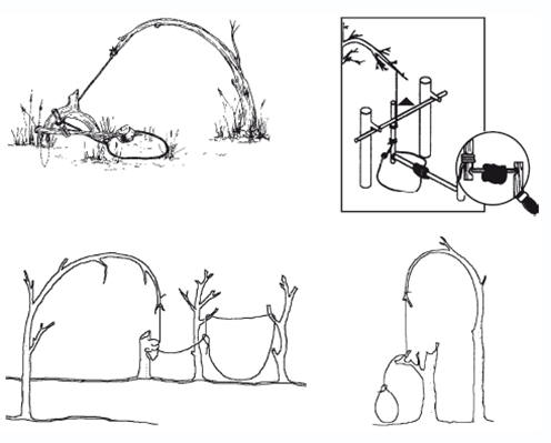 Справочник / Основы безопасной жизнедеятельности Все современные самоловы разделяются на переносные и стационарные. Применительно к ситуации автономного выживания нас будут интересовать только переносные. Деревянные переносные самоловы Переносные самоловы не устанавливаются на одном постоянном месте. По желанию их можно переносить на новые места. Переносные самоловы - это металлические дуговые ущемляющие и давящие капканы, всевозможные силки, петли и деревянные самодельные черканы и проскоки. Принцип действия у всех черканов одинаков. В различных районах различаются они лишь формой давящего приспособления и деталями насторожки. В деревянной рамке по направляющим прорезям сверху вниз передвигается Т-образный давящий стержень под действием силы натянутого лука или многовитковой цилиндрической стальной пружины. Сторожок с насторожкой взаимодействуют при помощи веревочной тяги. На рис. 2.5, а изображен черкан с квадратной рамкой, сбитой из дощечек. В средней части через отверстия в дощечках продет и укреплен лук, внизу - порожек. В нижней части боковых дощечек, по внутренней стороне, прорезаны пазы, по которым передвигается под действием тетивы лука Т-образный давящий рычаг (IV). Сторожок (II) - палочка толщиной в карандаш и длиной 58 см. На одном конце, в сантиметре от края, к сторожку привязан длинный шнурок, соединяющий сторожок с концом другой такой же палочки - челаком (III). Челак на коротком шнурке привязан к верхней поперечной перекладине. Насторожка в виде тонкой палочки (I) в приподнятом над порожком положении упирается концами в пазы и не дает вывернуться сторожку (II) из-под давящего рычага (IV). Для настораживания черкана давящий рычаг вместе с тетивой лука поднимают вверх. Тетиву подцепляют коротким плечом челака, который блокирует основную силу лука. Далее натягивают шнурок со сторожком, подхватывая его коротким плечом поперечину давящего рычага, а свободный конец упирают в насторожку, приподнятую над порожком. Черкан этой конструкции работает следующим образом. Зверек, пролезая между поперечиной давящего стержня и порожком, надавливает на насторожку. Она опускается вниз (рис. 2.5, а, I) и освобождает сторожок (II), который вывертывается наружу, освобождая челак (III), а вместе с ним тетиву, и лук срабатывает, прижимая поперечину давящего стержня к порожку (IV). По такому же принципу работают и черканы, изображенные на рис. 2.5 г, д. Лук - основная деталь в черкане. От его упругости зависит надежность работы и уловистость самолова. Лук рекомендуется делать из хорошо высушенной древесины бересклета, жимолости или из мелко-слойного ствола лиственницы. Можно и из кедра и ели, но из них получаются луки слабее. Деревянный лук можно заменить стальным прутом, лучше не одним толстым, а несколькими тонкими, связанными вместе. Обычно тетиву делают веревочной, но многие охотники делают ее из сухожилий. Черкан с рамкой (см. рис. 2.5, б) сделан из рогульки, а лук заменен многовитковой цилиндрической пружиной, работающей на сжатие.