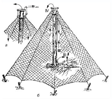 Рис. 2.11. Кроющие сети Расстораживать шатер может ловец из укрытия, сдергивая насторожку с помощью привязанного к ней длинного шнура (рис. 2.11, а). Эту же насторожку можно использовать для оборудования шатра, который расстораживают сами птицы, посетившие ловушку. Для этого на свободный конец сторожка рис. 2.11, б (IV) привязывают шнурок длиной до основания сторожевого кола, на котором на высоте 15 см от земли делают зарубку. На уровне этой зарубки в условиях настороженного шатра к натянутому шнурку привязывают челак (дополнительный сторожок) - палочку длиной 10 см (II). Короткий конец этого челака-сторожка упирают в зарубку на сторожевом колу, а свободный опускают и подпирают его опадным полом - тонкой дощечкой или палочкой, на которую настилают решетку из тонких прутиков рис. 2.11, б (V). На эту решетку и вокруг нее рассыпают корм. Птицы, посетившие площадку с подкормкой, склевывая ее и перебегая с места на место, наступают на решетку - пол (I), опуская сторожевую палочку вниз и тем самым освобождая челак (II), который вывертывается кверху вместе со шнуром и отпускает верхний сторожок (III). Последний, соскочив со сторожевого кола, освобождает вершину сети, и шатер падает вниз, накрывая птиц. Перепелов ловят легкой сетью площадью 8х8 м, связанной из тонкой нити зеленого или серого цвета с ячеёй 2,5-3,5 см. С утра, до рассвета, ловец выходит в поле и накидывает сеть на траву таким образом, чтобы птица могла свободно зайти под нее. Затем перепелов подманивают с помощью манка или самки перепела, посаженной в садок. Когда ловец убедится, что перепел находится под сетью, птицу спугивают, и она путается в сети. В недалеком прошлом таким способом практиковался промышленный отлов перепелов. В настоящее время в связи с катастрофическим сокращением численности перепелов отлов их сетями повсеместно строго запрещен. Автор: Михайлов Л.А.