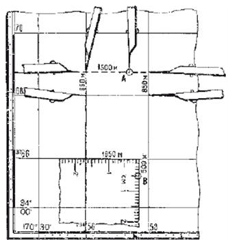 В данном случае координатомер наложен так, чтобы горизонтальная шкала его была совмещена с северной стороной квадрата, а отсчет против западной его стороны соответствовал разности координаты Y объекта и оцифровки этой стороны (29 457 км 650 м - 29 456 км = 1 км 650 м). Отсчет, соответствующий разности оцифровки северной стороны квадрата и координате Y объекта (3766 км - 3765 км 500 м), отложен по вертикальной шкале вниз. Точка против штриха у отсчета 500 м будет указывать положение объекта на карте.